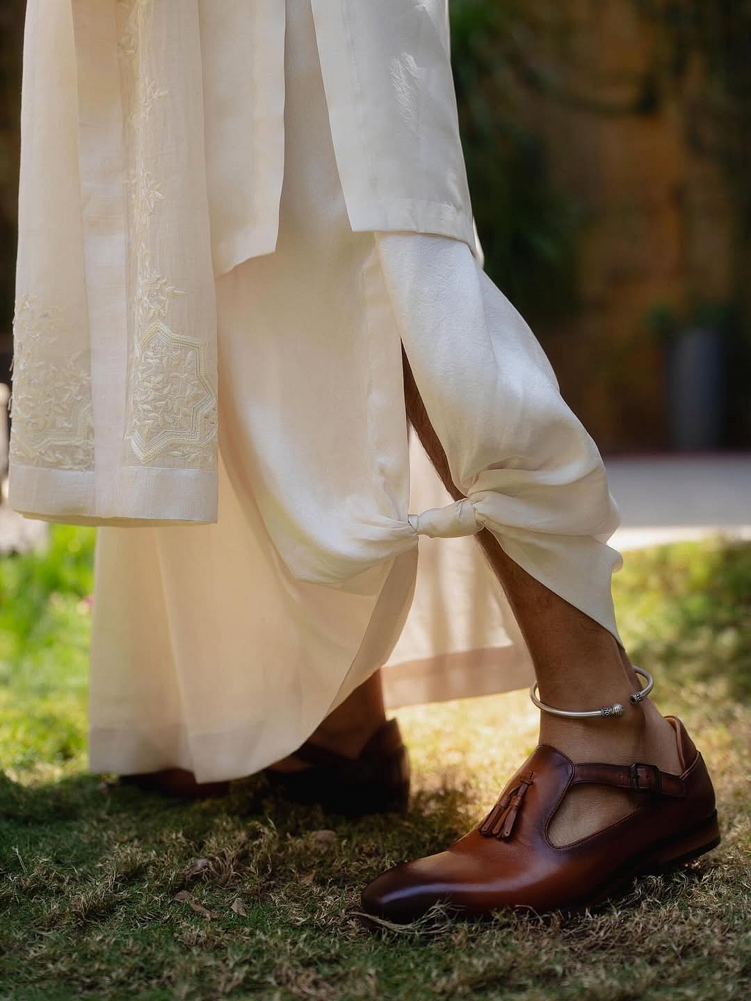 Adding a surprising traditional element, Arjun also styled his look with kada-style anklets, also known as Toda, proving that modern menswear can embrace heritage jewellery in unexpected ways. Brown mojris and his signature tinted sunglasses completed the look, giving the entire outfit a contemporary finish.