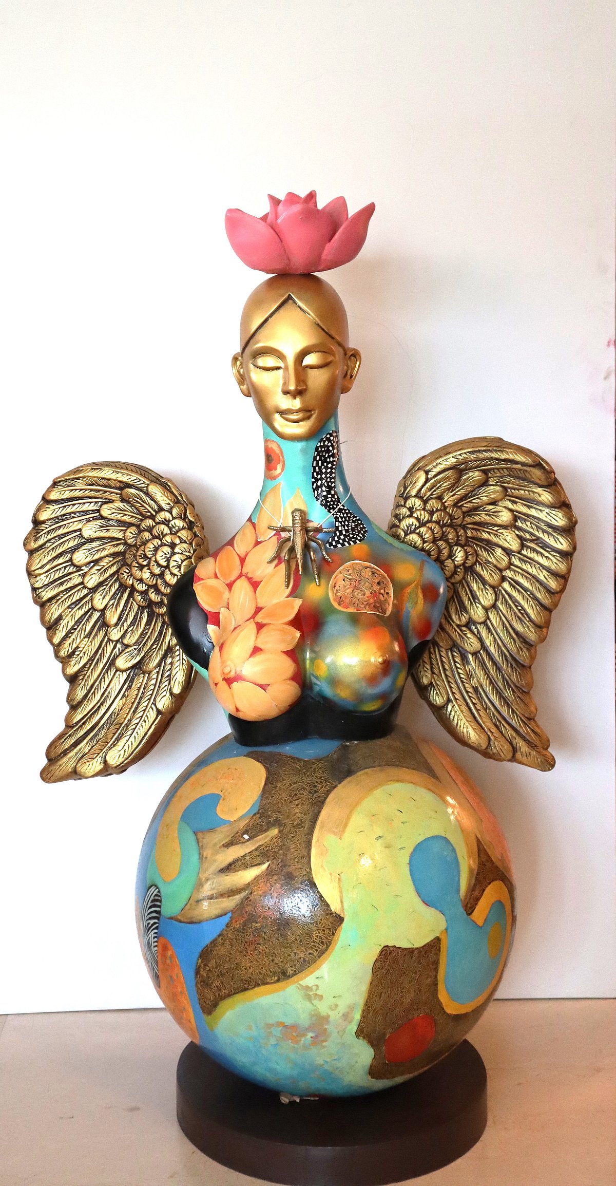 The sculptures are titled Formless Free. They are angels on a spherical ball. On the top of the ball is the torso of an angel with massive golden wings and lotus on its head. “The lotus signifies positivity and goodness,” says Nandita “I feel that every human being is good. I see goodness and God in everybody,” she adds.