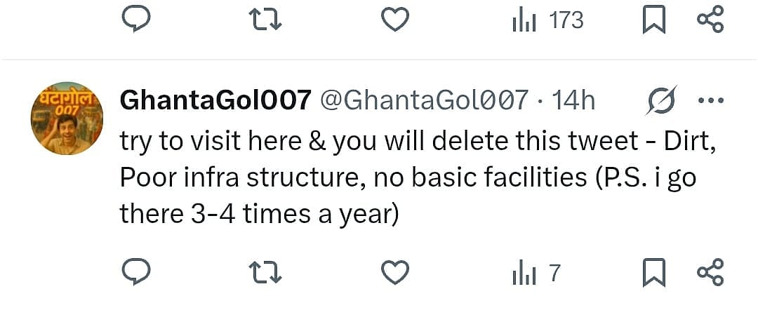 One user commented, "Try to visit here & you will delete this tweet - Dirt, Poor infra structure, no basic facilities (P.S. i go there 3-4 times a year)."