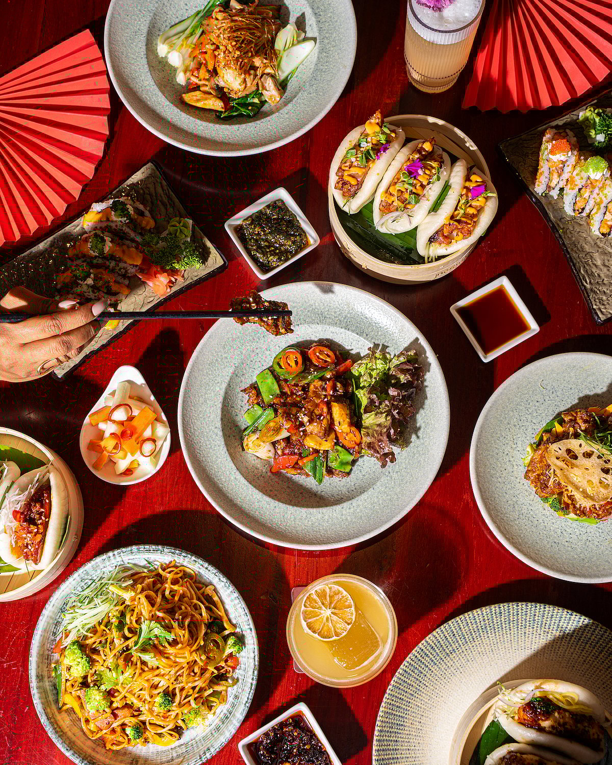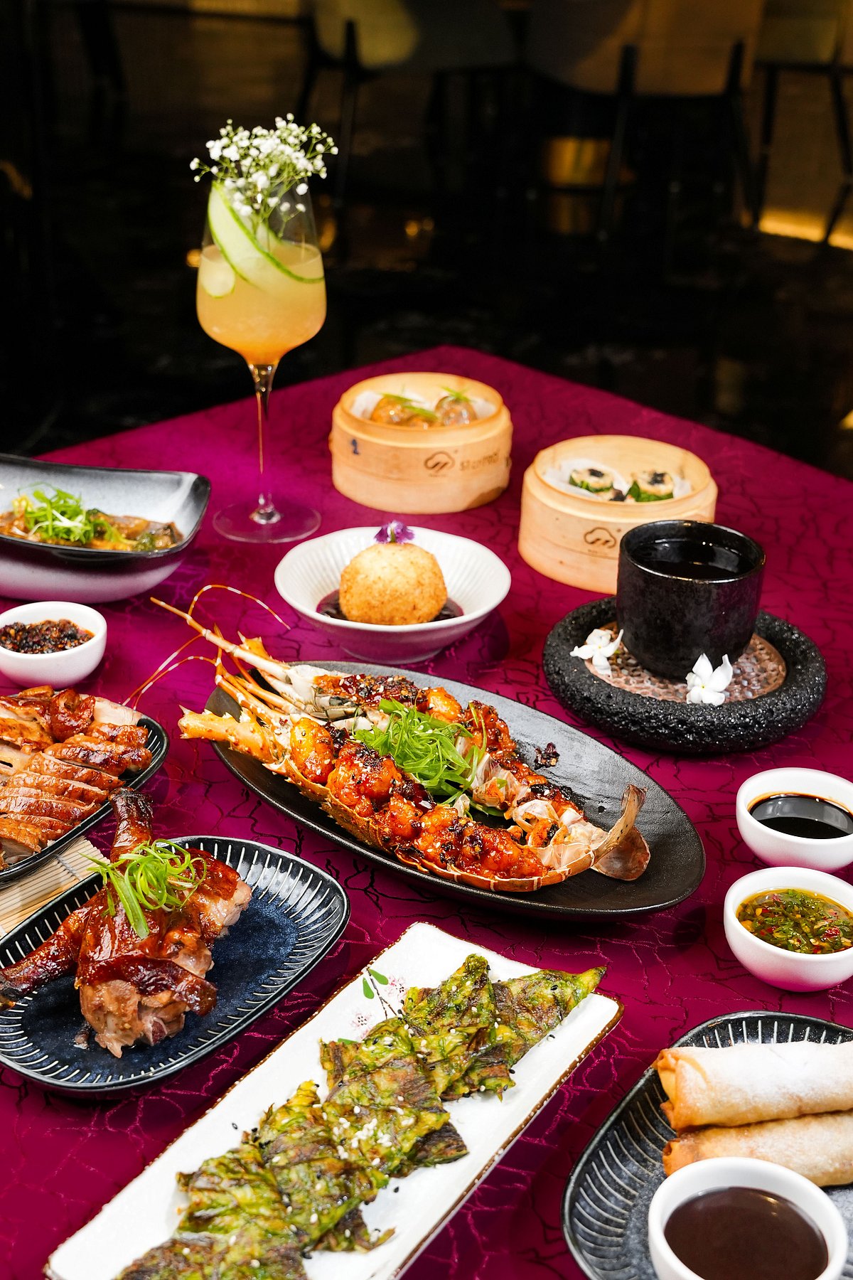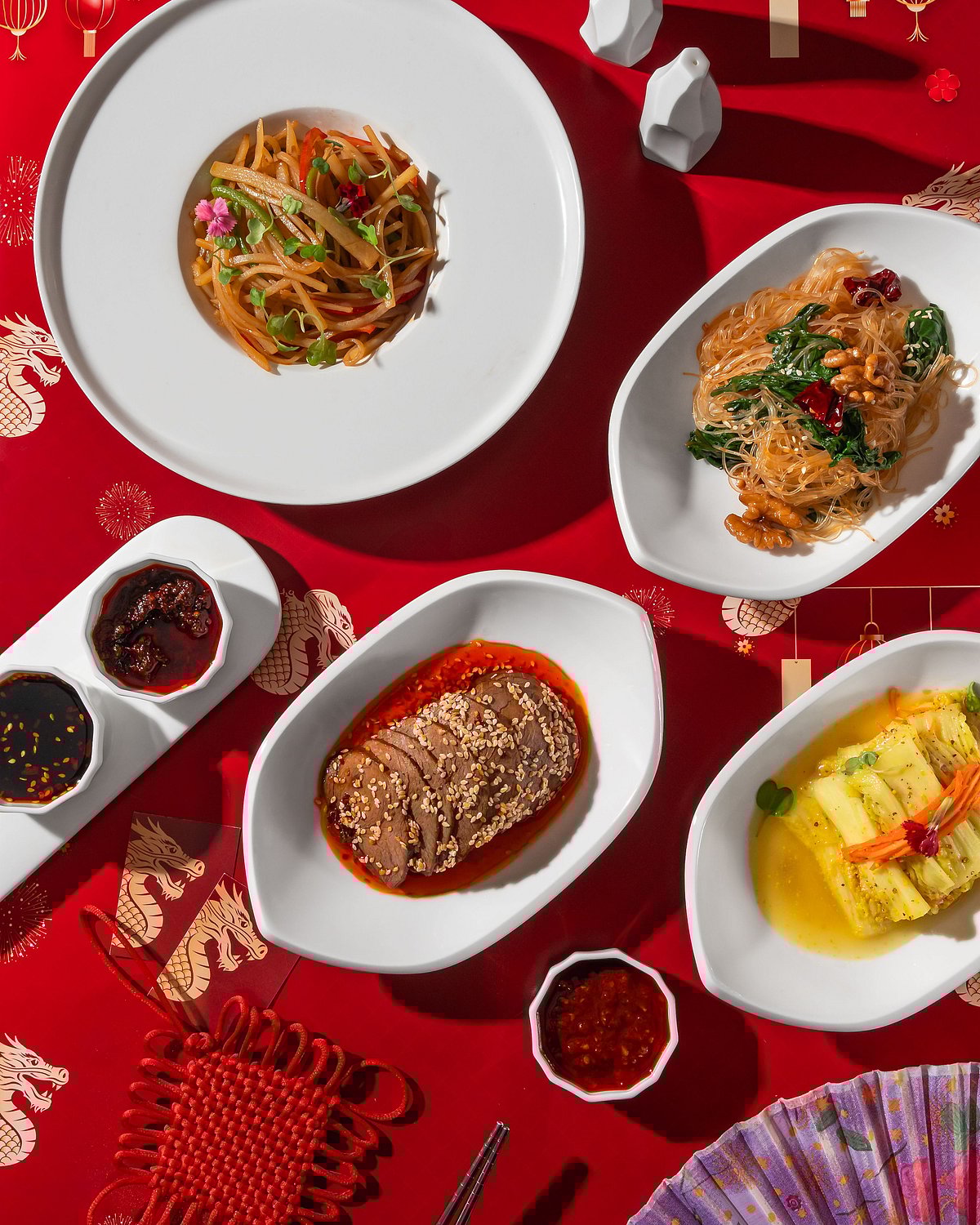The Deng menu leans comforting, with Chinese leek pepper soup, Mala chicken wings, Kung Pao chicken, Xiao Long Bao, braised eggplant, and blue pea edamame fried rice. A limited-edition cocktail selection, including Golden Prosperity and Red Lantern, completes the festive mood.
