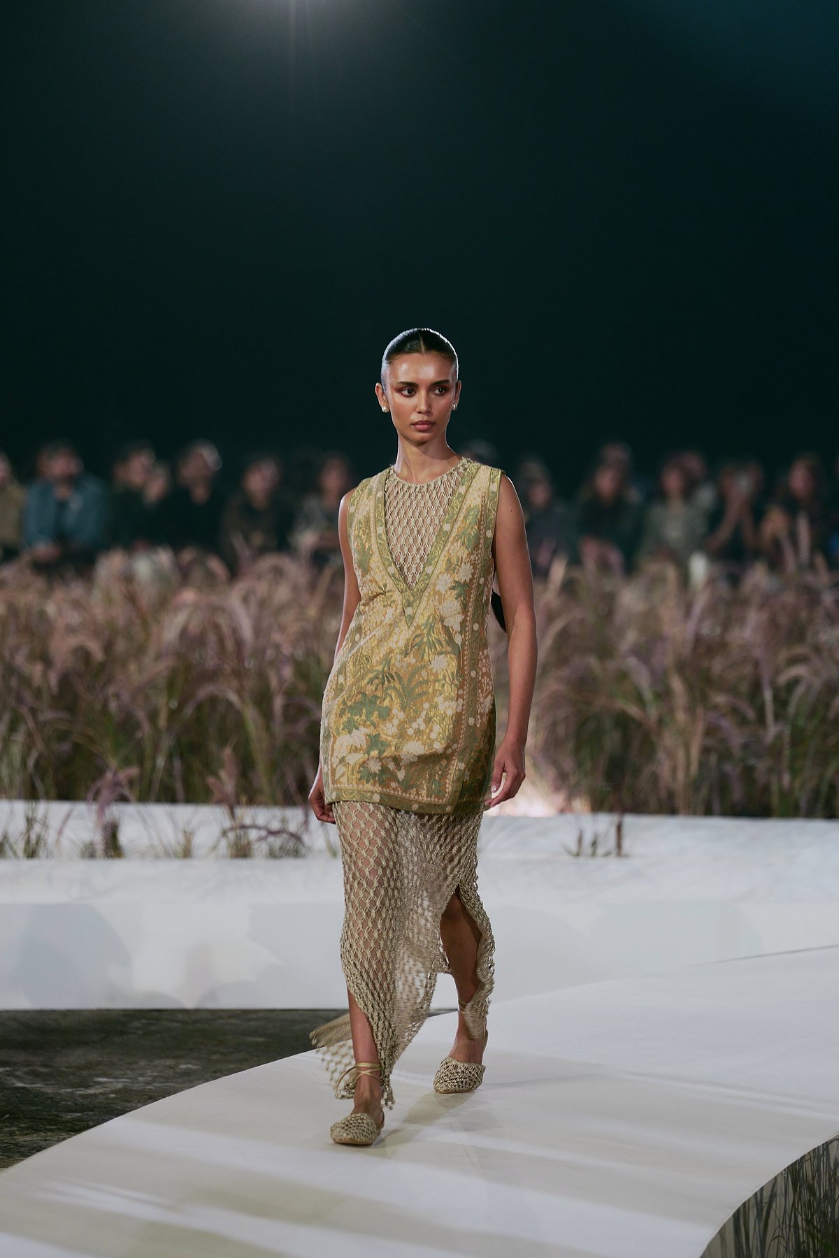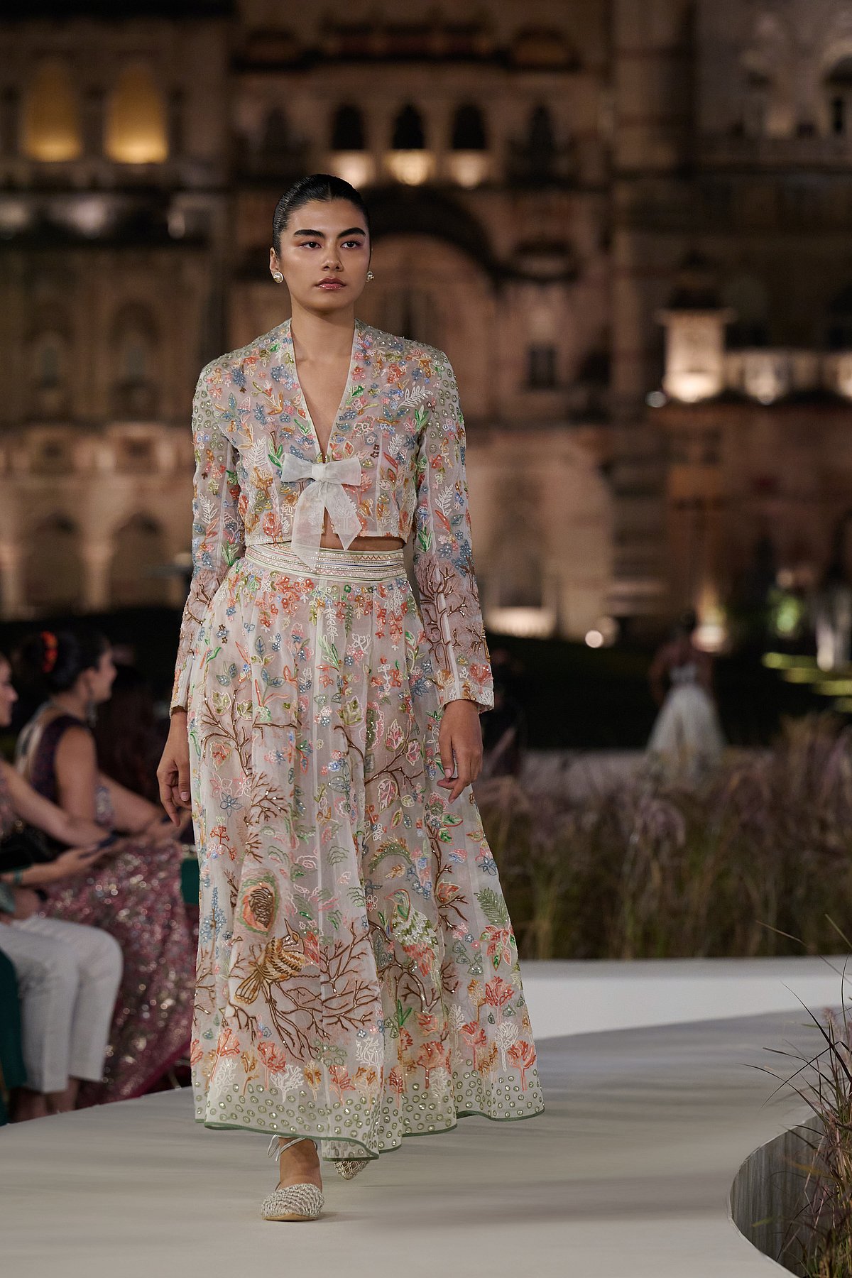 At Rewild 2026, she gathered conservationists, philanthropists and community leaders to discuss wildlife protection and human–animal coexistence, framing Rewild as both a fundraiser and a forum for change. Staged against the majestic palace in the evening, the show unfolded with quiet authority, reinforcing that Indian luxury today must be regenerative and conscious of the ecosystems it draws from. For the first time, the House introduced handwoven macramé, inspired by the 140-year-old banyan tree within the palace grounds. She spoke louder with her fashion; age-old crafts consciously shaped for the present, with silhouettes that moved seamlessly between luxe prêt and eveningwear. Fresh, energised and designed for diverse demographics and occasions, the collection honoured forest-inspired motifs that came alive through embroidery, bows and surface detailing. Banarasi textiles, woven by master artisans, found new expression in contemporary styles, while hand-painted Pichhwai and garments crafted by women artisans from SEWA Gujarat reinforced the human story behind the clothes. An evolving palette of ivories, warm golds, butter yellow, deep emeralds, midnight blues and inky blacks mirrored the spirit of rewilding.