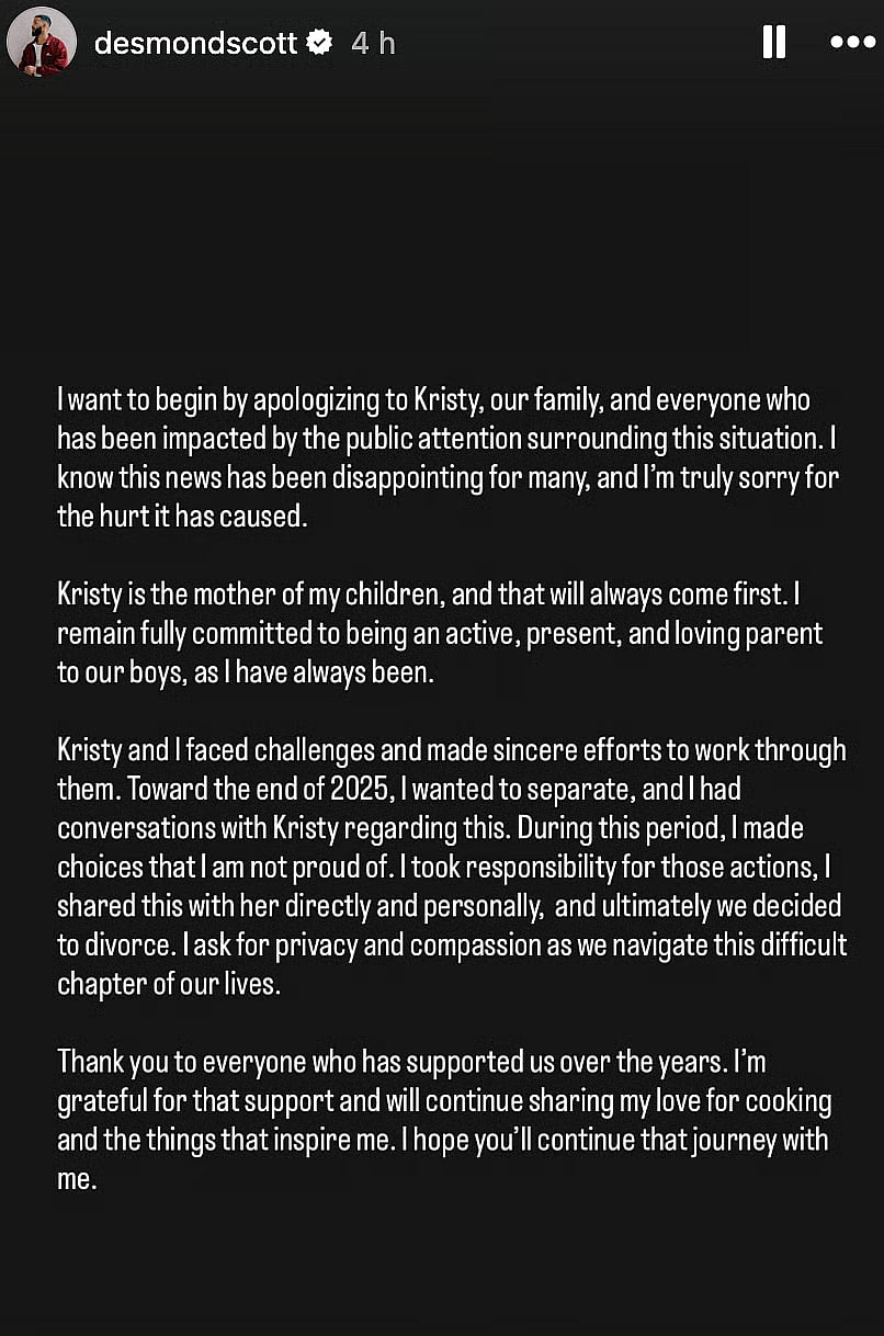 Desmond also thanked followers for their support over the years and shared that he plans to continue focusing on his culinary journey while co-parenting his children.