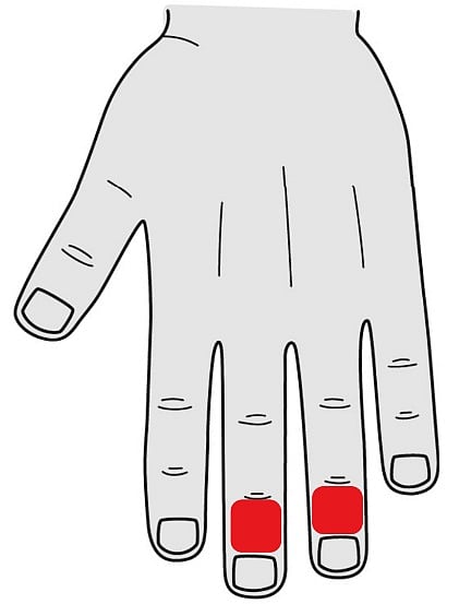 For circulation and nerve support, use a Sujok ring and role it on the fingers. Do not wear it. Apply ajwain or methi seeds on highlighted area (see figure). Use a medical adhesive tape to hold them in place. Keep them for two-three hours daily.