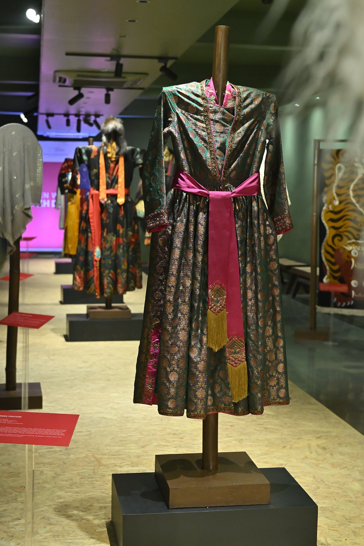 What gives the exhibition its emotional depth is the designers’ intimate relationship with their material. Bringing together four women contemporary Ladakhi voices — Saldon; Jigmat Norbu and Jigmat Wangmo of Jigmat Couture; Padma Yangchan of Namza Couture; and Zilzom by Stanzin Palmo—the exhibition shows how ancestral techniques such as hand-spinning, weaving and resist dyeing are reimagined into modern silhouettes and sculptural forms. Ceremonial garments sit alongside ritual objects and experimental installations, underscoring how Ladakh’s design language has always negotiated the sacred and the functional.
