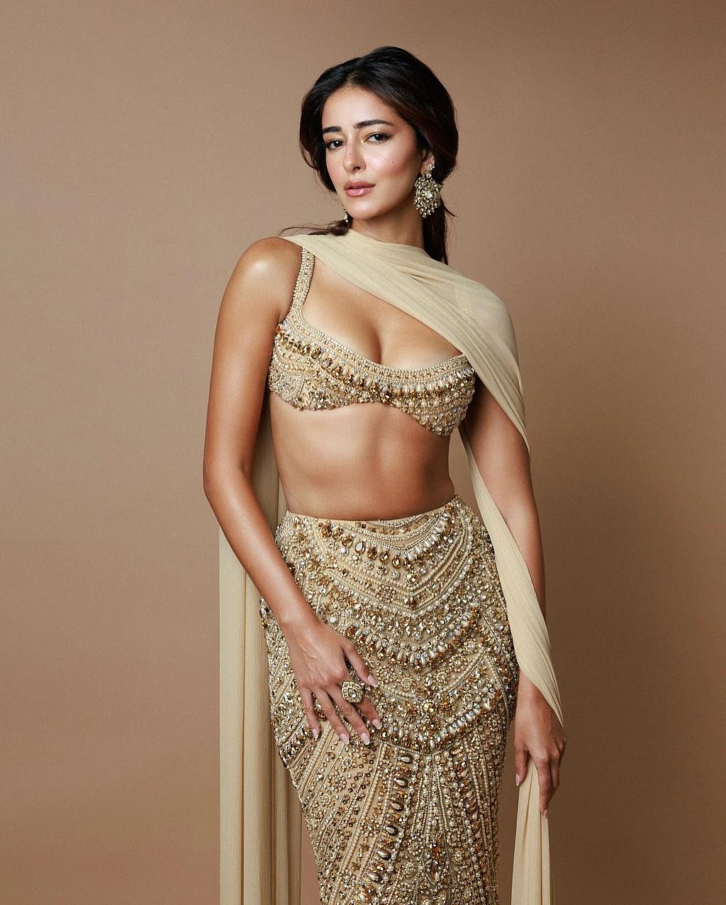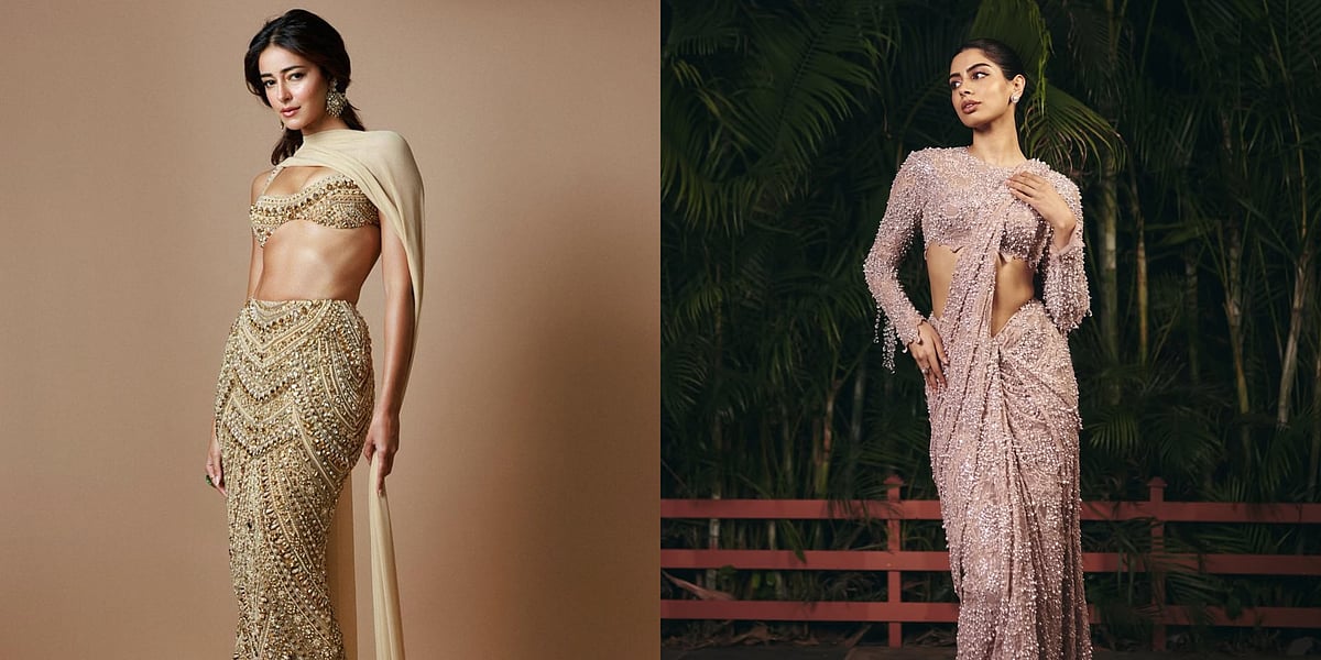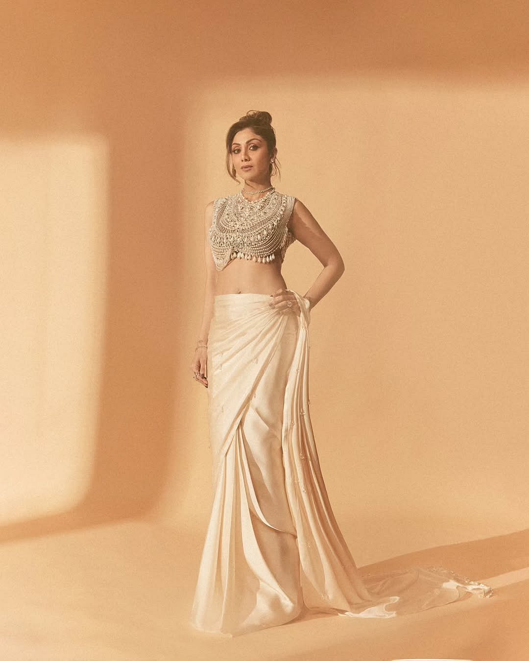 The classic six-yards got a whole new twist this season. This Diwali the blouse is the statement piece—corset cuts, one-sleeves, backless or structured silhouettes—and the pallu? It’s now draped with attitude. Stars like Shilpa Shetty and Ananya Panday are teaming heavily designed blouses with the pallu draped around the arms, letting the couture top do the talking. For your saree game: invest in a blouse that makes a difference, drape the pallu over the arm or belt it, and skip the heavy dupatta for a modern clean look.