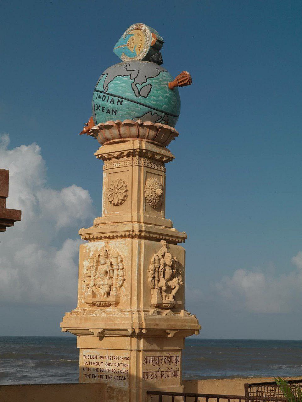 Baan Stambh (Arrow Pillar) on the side of the Somnath Temple indicates towards Antarctica. The pillar features a Sanskrit phrase, "आसमुद्रांत दक्षिण ध्रुव,पर्यंत अबाधित ज्योर्तिमार्ग" inscription that translates to "there's no hindrance in the straight line from this point to the South Pole." An arrow atop the pillar indicates a straight line towards the Southern Hemisphere, signifying continuous ocean until Antarctica.
