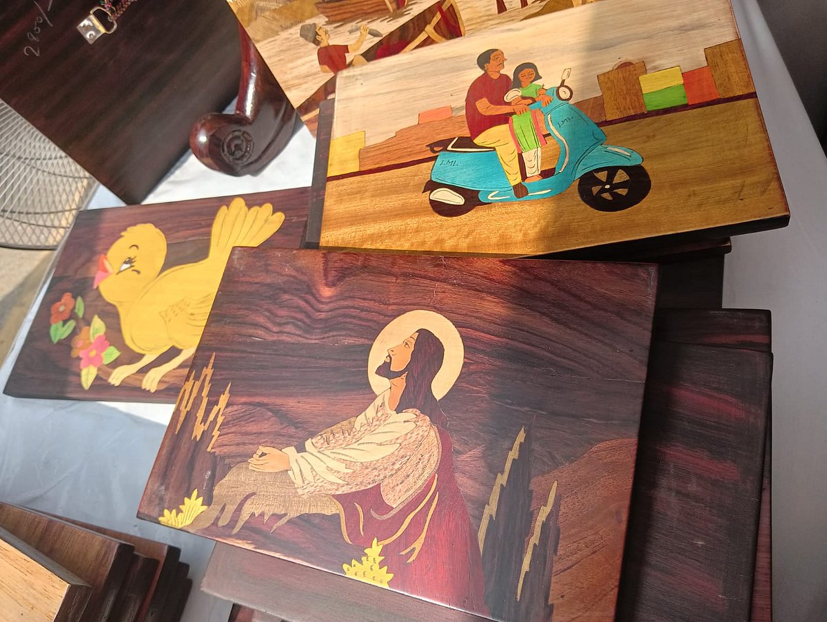 Traditionally reserved for royalty, the art was later introduced to the public through jewellery boxes, wall hangings, and decorative panels. What makes it unique is the use of natural colours derived entirely from different types of wood, sourced locally.