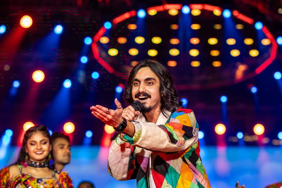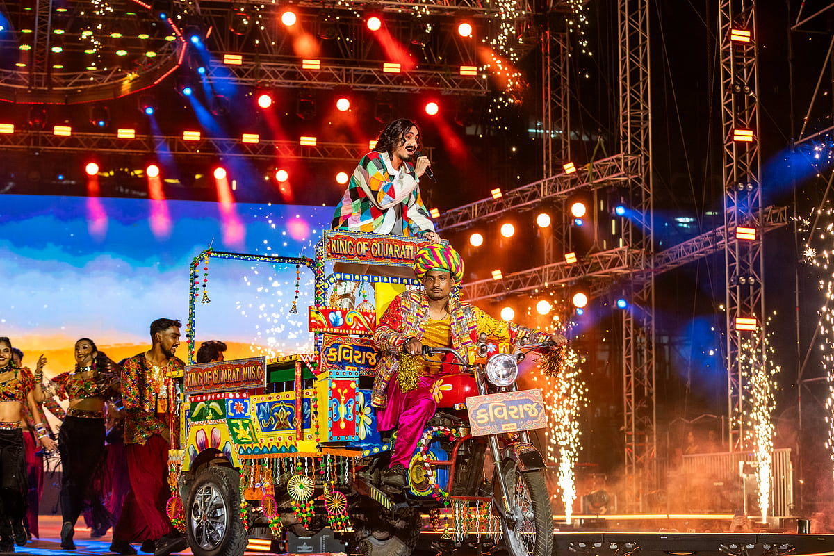 Fireworks, stage effects, and a high-energy dance troupe set the tone as folk artist and Khalasi singer Aditya Gadhvi took the stage with his foot-tapping numbers at Mumbai's Jio Garden.
