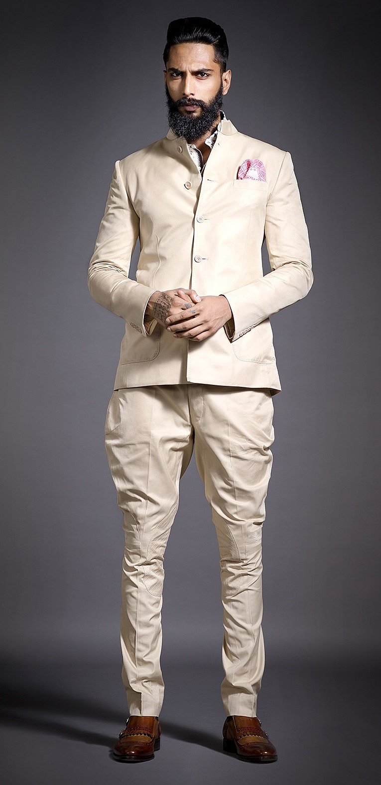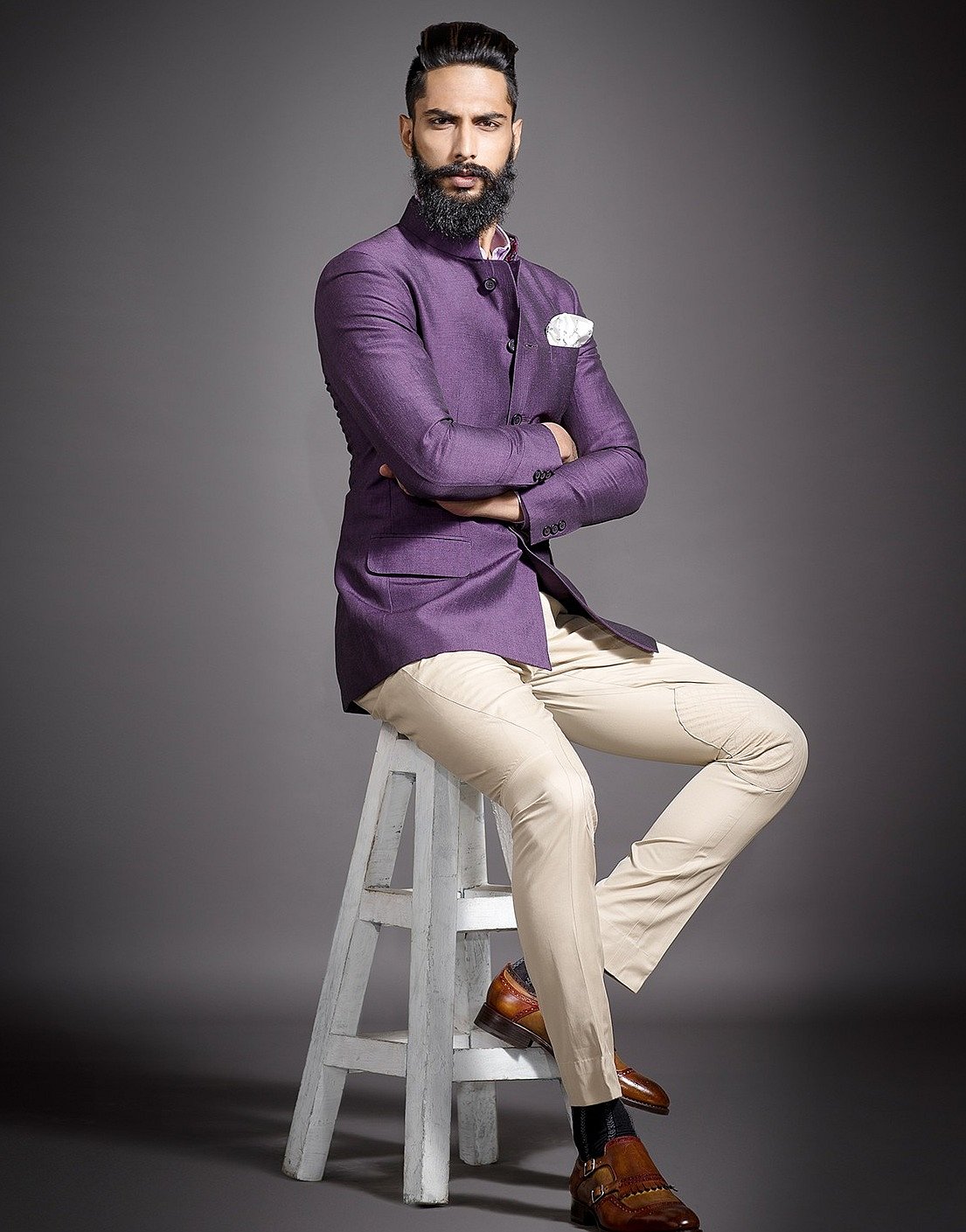Wear an achkan, paired with breeches which have more structure and are made with heavier fabric to emphasize the evening party element and separate it from day wear. Once you have the classics in place, you can add personality to your outfit by playing with luxurious fabrics such as silk or cashmere and bolder colours. These should be reserved for your accessories such as your pocket squares and jewelled buttons.
