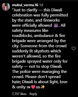 However, Verma later stepped in to clear the air. “Just to clarify — this Diwali celebration was fully permitted by the state, and fireworks were officially allowed. All safety measures like roadblocks, ambulance & fire brigade were arranged by the city,” he wrote in the comments.