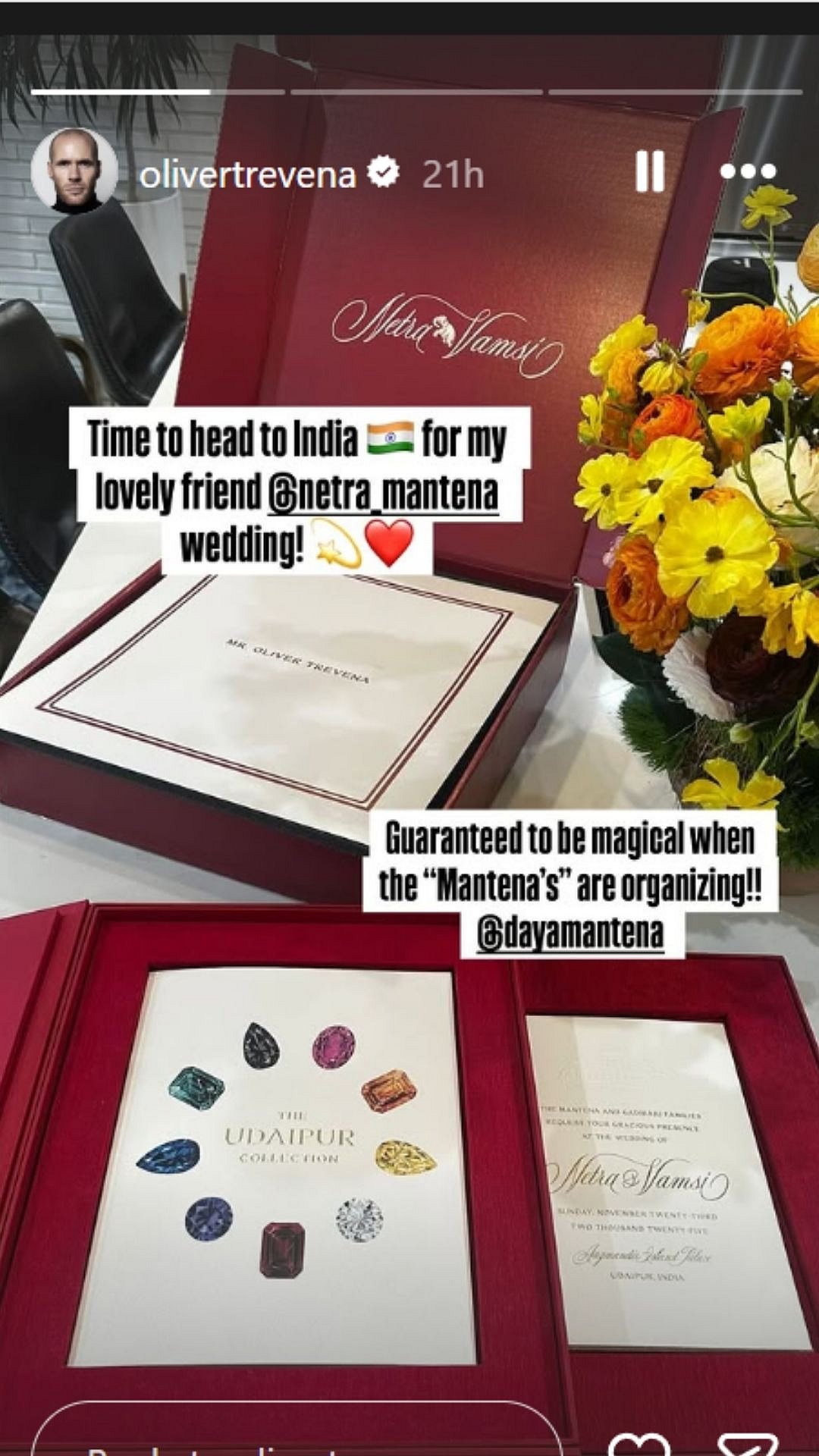 The first official look at the wedding invitation surfaced through Hollywood actor Oliver Trevena’s Instagram story who looks like a friend of Netra's and the design confirms that the wedding is set to be a luxury spectacle. He wrote, "Time to head to India for my lovely friend @netra_mantena wedding." He also tagged brother Daya Mantena and wrote, "Guaranteed to be magical when 'Mantena's' are organising.