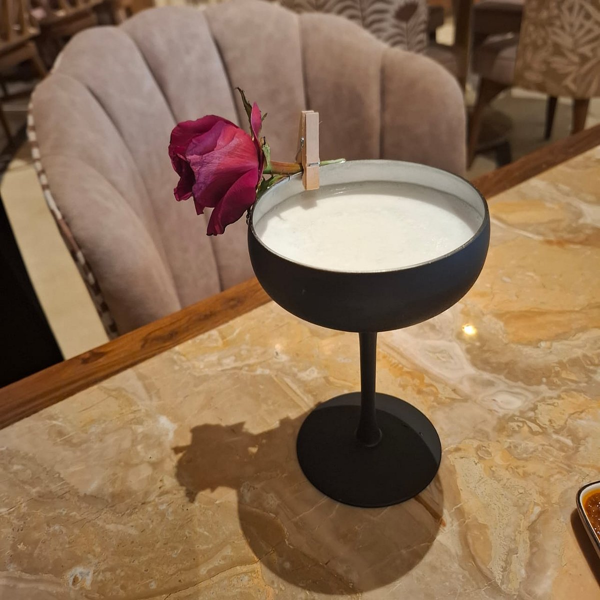 While I wonder what I should have for mains, I am served another signature cocktail – Shooting Star – with a flair. A black glass with a white vegan foam and the server lights up the garnish on the rim to reveal a red rose. “The concept is of hope in the darkness of the universe,” explains Ashwin. Slightly lime forward.