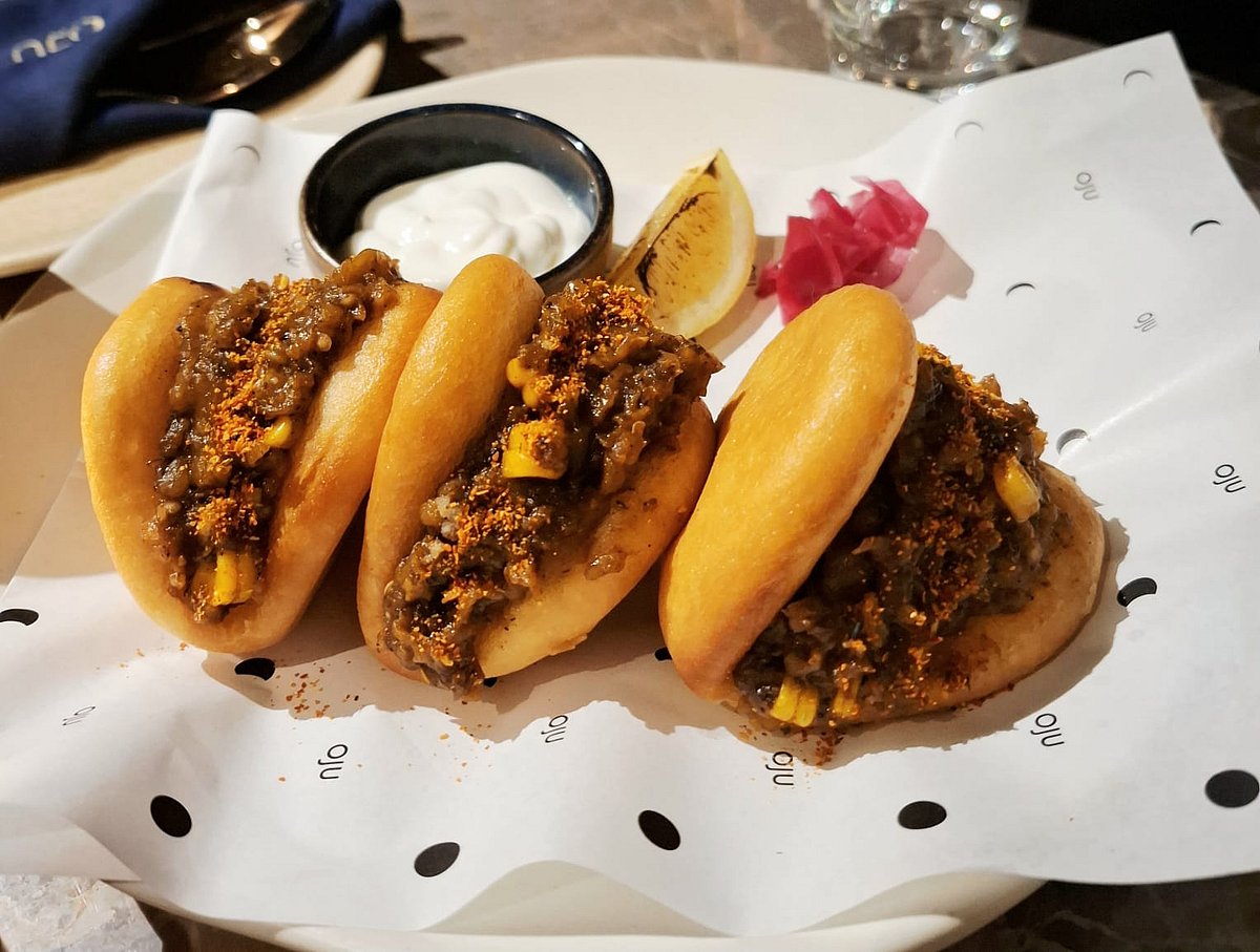 I prefer the Veg Mantao. It is served with lemon mayo, pickled radish in beetroot juice, and a slice of lime. Smoky eggplant and corn tossed in barbecue sauce. Juicy, finger-licking if you like eggplant.