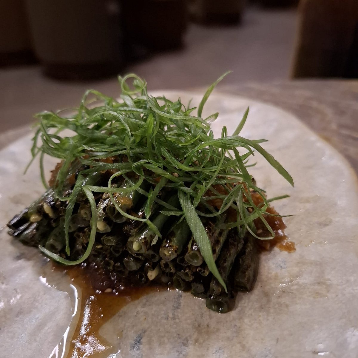 I start with Saketini. Gari-infused vodka, sake, rice water, dry vermouth, and a dash of Aperol. Starts sweet on the palate and ends with Aperol. Team it with Spinach with Gomadare sauce, the spinach salad that’s a medley of textures. Sesame seeds are the umami. Vegetarians should also try the Charred Beans – French beans tossed in onion wafu sauce. Caramelised onions enhance the wafu flavours. Try the Seaweed Salad if you are in an adventurous mood. Five types of seaweeds tossed in homemade goma sauce, garnished with pickled pears, which are the USP of the dish. Crisp and slightly nutty.