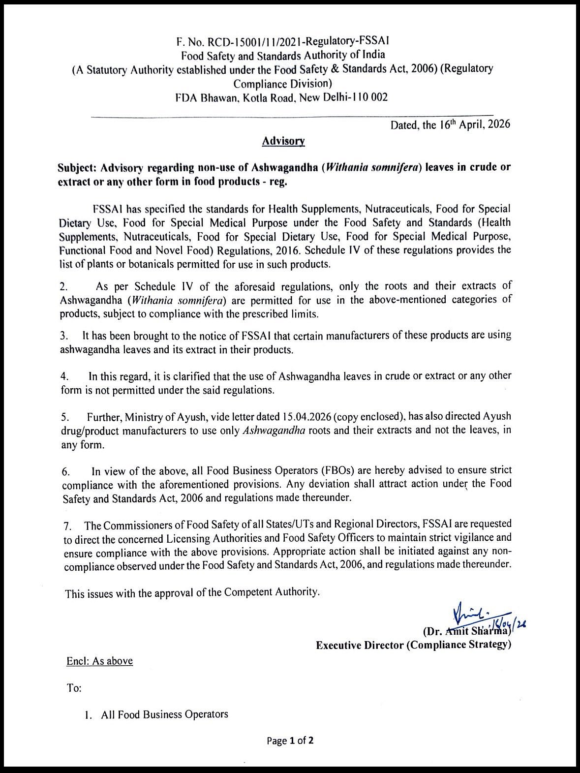 The FSSAI has issued an advisory to clarify the permitted use of Ashwagandha in food products and supplements on April 16, 2026. Ashwagandha, which has been promoted as a herb and tonic helping in vitality and longevity, has now been banned by the statutory body of India. Under the Food Safety and Standards (Health Supplements and Nutraceuticals) Regulations, 2016, there is only a fixed list of approved plants and their specific parts that can be used, and according to that list, Schedule IV, only the root of Ashwagandha and its extracts are allowed, which must be used within prescribed safety limits.