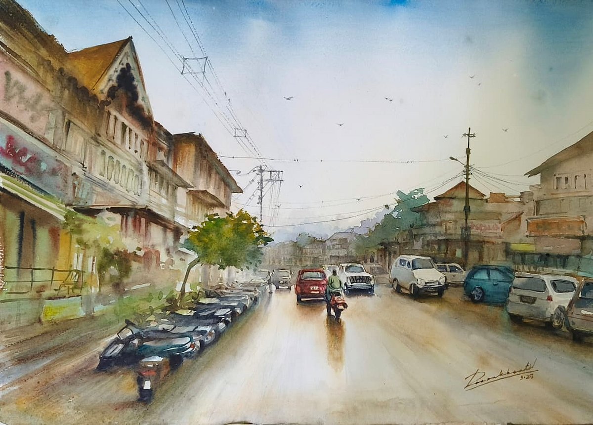 He later shifted fully to fine art, guided by stalwarts like Vasudeo Kamath and Vijay Achrekar during his landscape study tours with the Art Society of India and Sanskar Bharati.