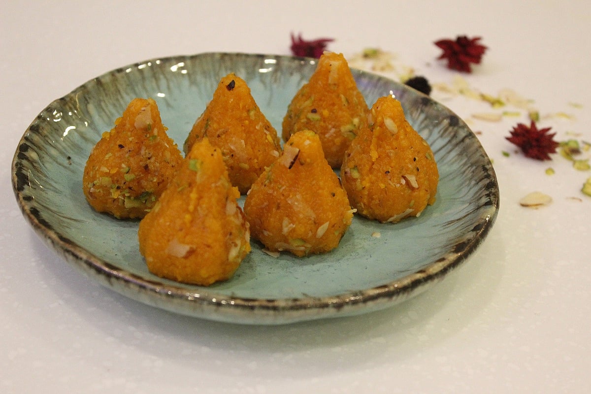 Motichoor modak: Use motichoor recipe but instead of rolling it into roundels, give the shape of a modak. Add almond, pista slivers and saffron for an added colourful effect, says Maharaj Bhawar Singh, Corporate Chef — Khandani Rajdhani in different cities across India and with International outlets too.