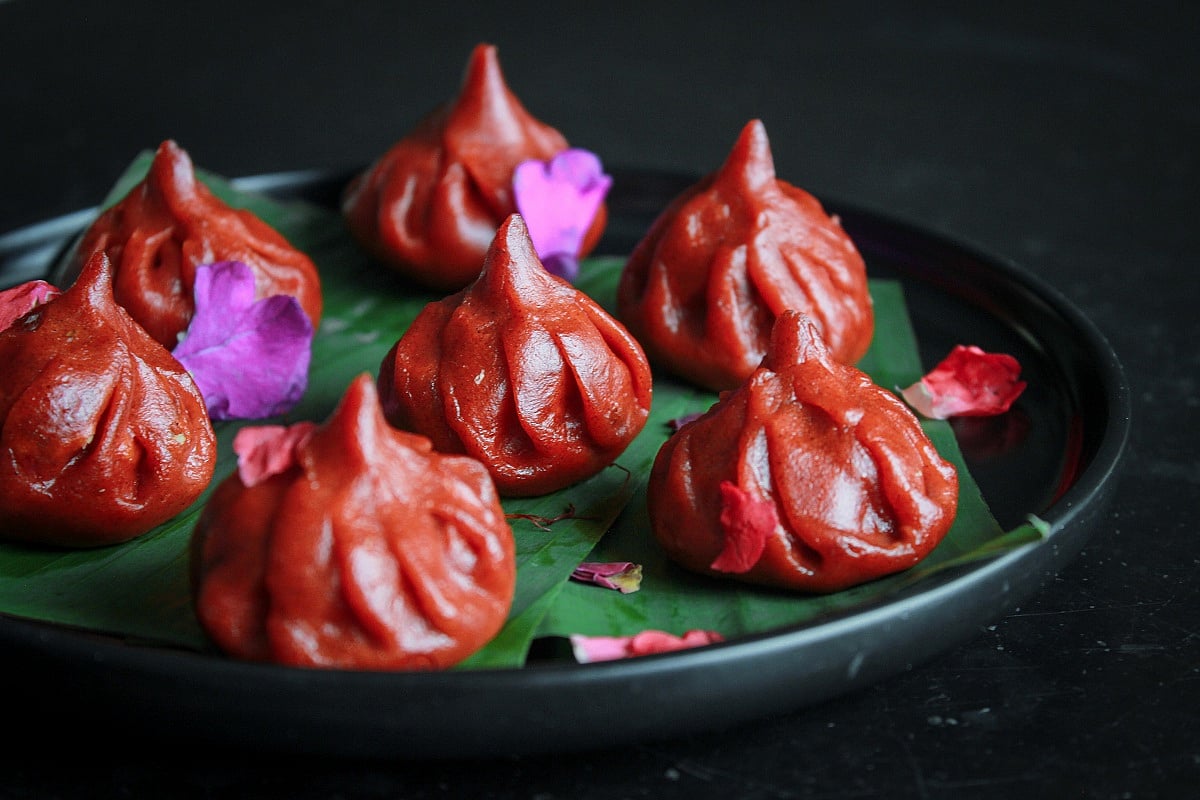 Method: Boil water in a pot. Add one gram saffron, shredded rose and hibiscus petals to boiling water. Boil till it releases a bright red colour. To the mixture, first add rice flour and mix together followed by ragi flour. Mix it well to form a consistency of dough and let it rest for 10 minutes. For the stuffing, add chopped figs, chopped dates, grated coconut, rose and hibiscus petals, remaining saffron and cardamom powder to a pan and mix well. Cook this mixture for five minutes to lightly roast it till all ingredients are mixed well and set aside. Take a bit of dough and roll into a ball two inches wide. With a rolling pin, roll out the dough ball as thin as possible into a round shape. Place the round sheet on your palm and add a spoonful of the stuffing in the centre. Pinch the ends of the sheet together, forming pleats as you go around the sheet. Slowly close the pleats together till the tips meet and pinch the top to close the opening. Repeat the process with the remaining modaks. Place a steamer in a pan filled with water. Line the steamer with a banana leaf, grease it with some oil and place the modaks for steaming. Steam for 10 minutes. Remove from the steamer and garnish with petals and saffron. Serve hot.
