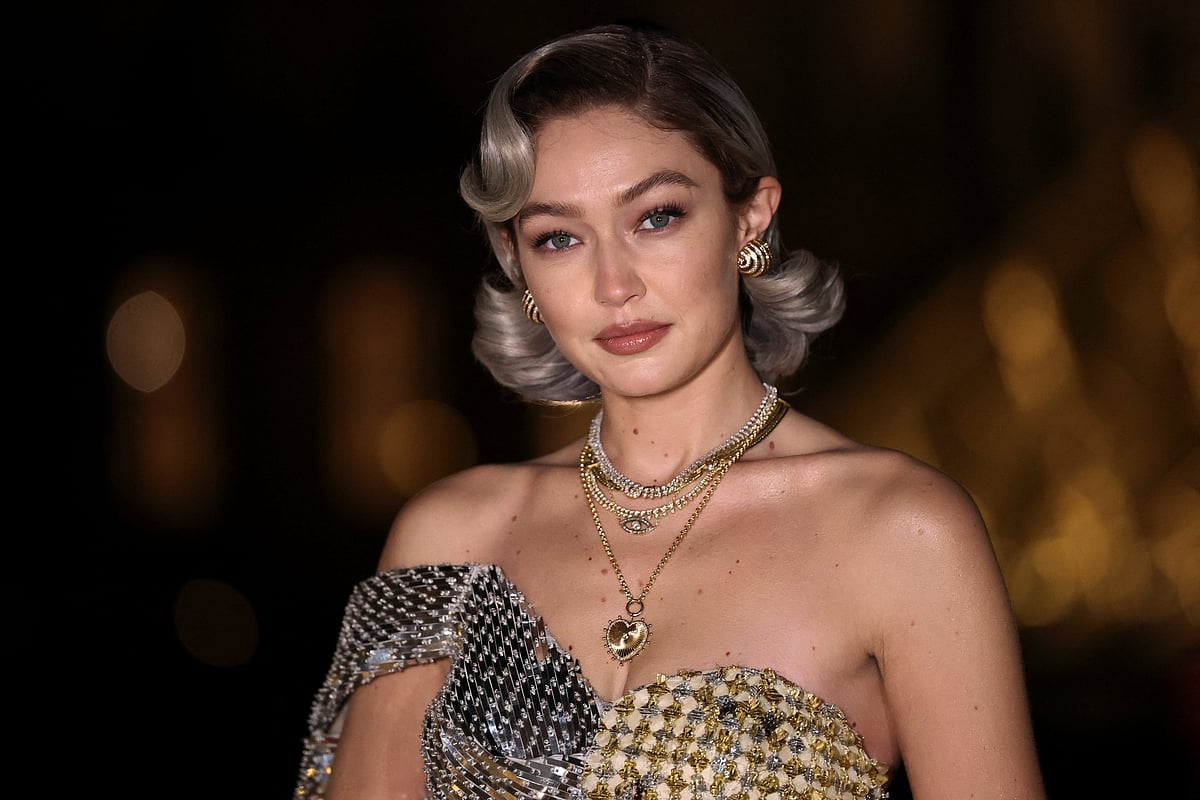 To enhance her look, Hadid accessorised with a combination of gold and white gold jewelry, including stacked rings, delicate necklaces, and statement earrings-each carefully selected to harmonise with the trio of metallic tones in her dress.