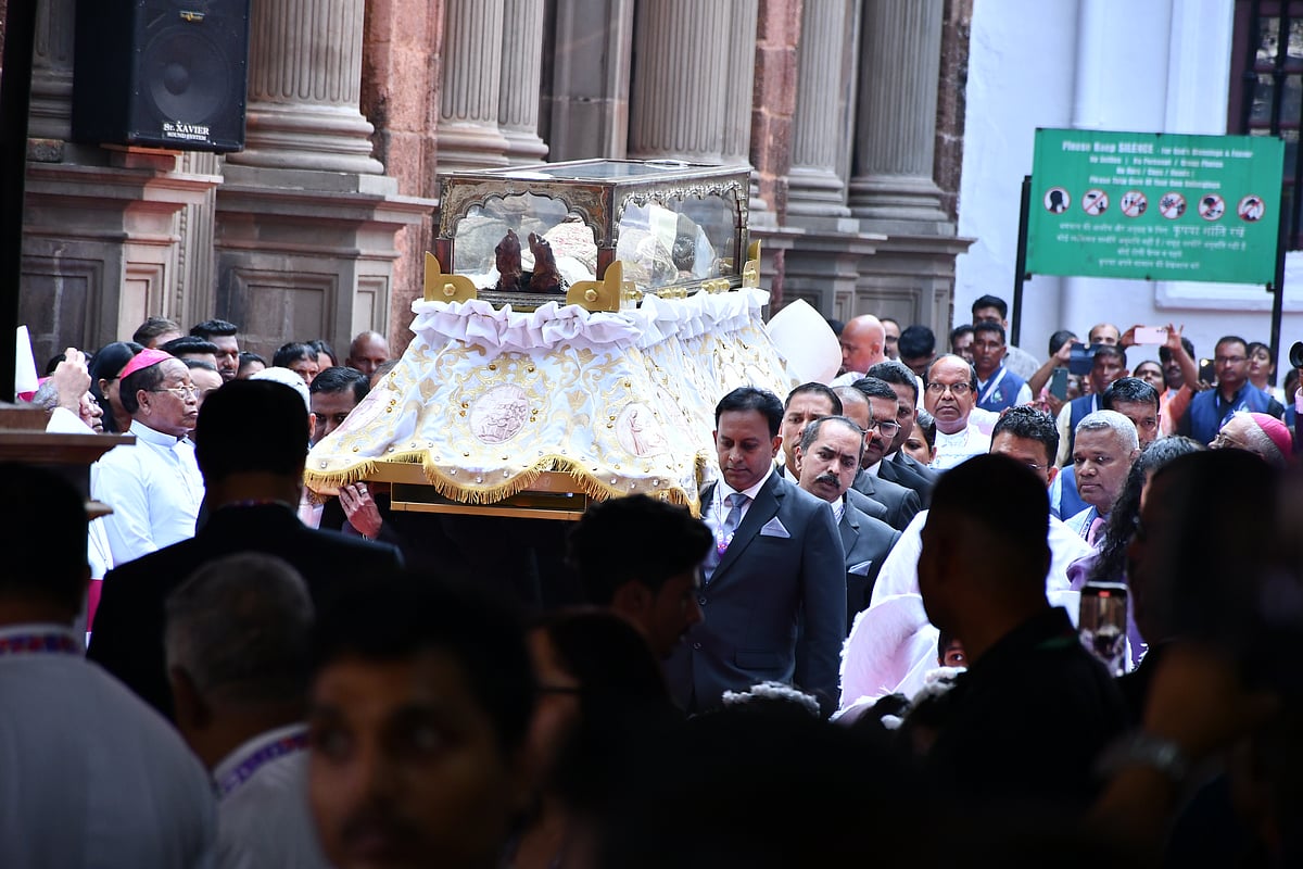 The grand opening on November 21 was marked by the liturgical celebration followed by a ceremonious procession of the relics to the Se Cathedral, opposite the Basilica de Bom Jesus. Breaking away from the tradition, a special electric carriage inspired by the silver casket that houses the relics was used to transport the body. A human chain of 1500 plus lined the procession route. In a display of communal harmony, representatives from the Hindu and Muslim communities joined the celebrations as well. A brass band of 100 musicians, led by Mestre Fr. Simon D’Cunha added to the joyous festivities.