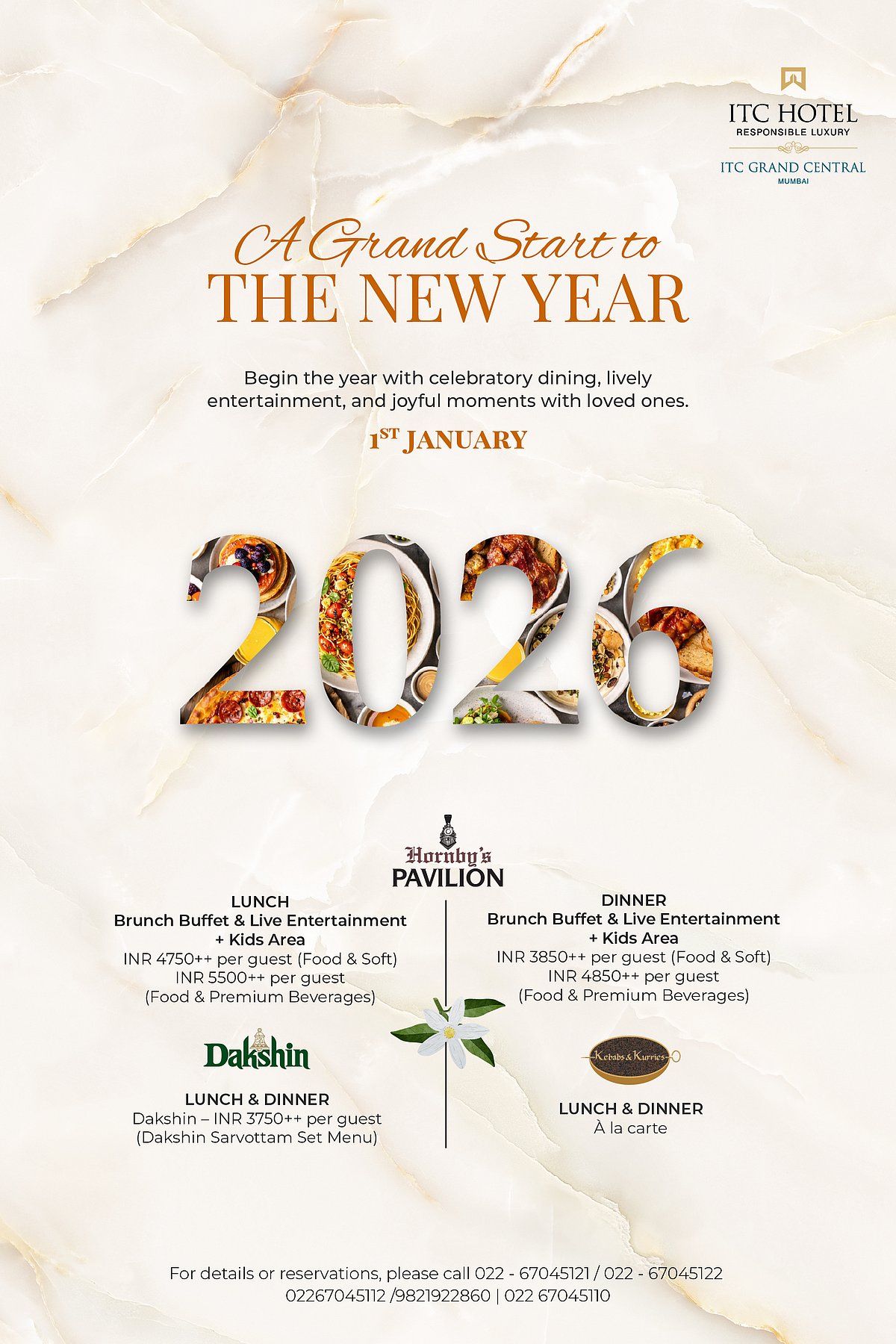 Pondichery Cafe dresses up for the occasion with festive decor, gourmet stations, seafood, roasts and indulgent desserts. Premium spirits and wines keep things celebratory, while the champagne upgrade turns brunch into a full-fledged toast to the year ahead. Expect a luxurious, take-your-time atmosphere.