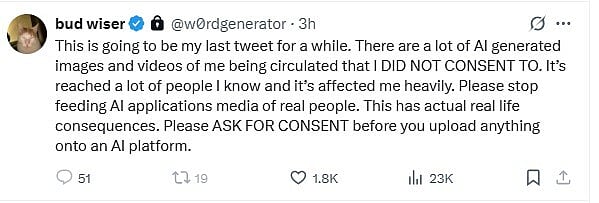 "This is going to be my last tweet for a while. There are a lot of Al generated images and videos of me being circulated that I DID NOT CONSENT TO. It's reached a lot of people I know and it's affected me heavily. Please stop feeding Al applications media of real people. This is actually real life consequences. Please ASK FOR CONSENT before you upload anything onto an AI platform."