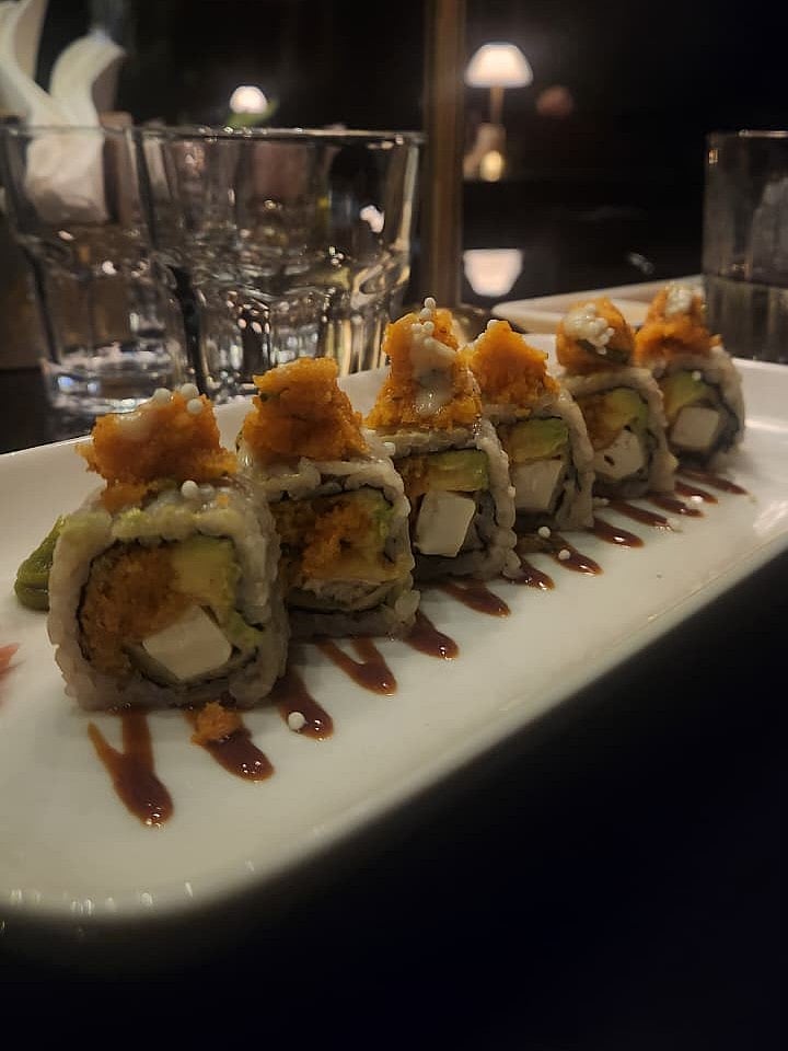 Then we savoured the Enoki Mushroom & Asparagus Dimsum, a lightly crunchy and veggie-forward bite, offering mild flavours. Moving on, we had the Truffled Tofu Sushi, a creative vegetarian twist with fried tofu, truffled cheese, avocado teriyaki, pozu mayo, and rice crackers. The combination of crunchy tofu, creamy avocado, and subtle truffle made for a pleasing bite.
