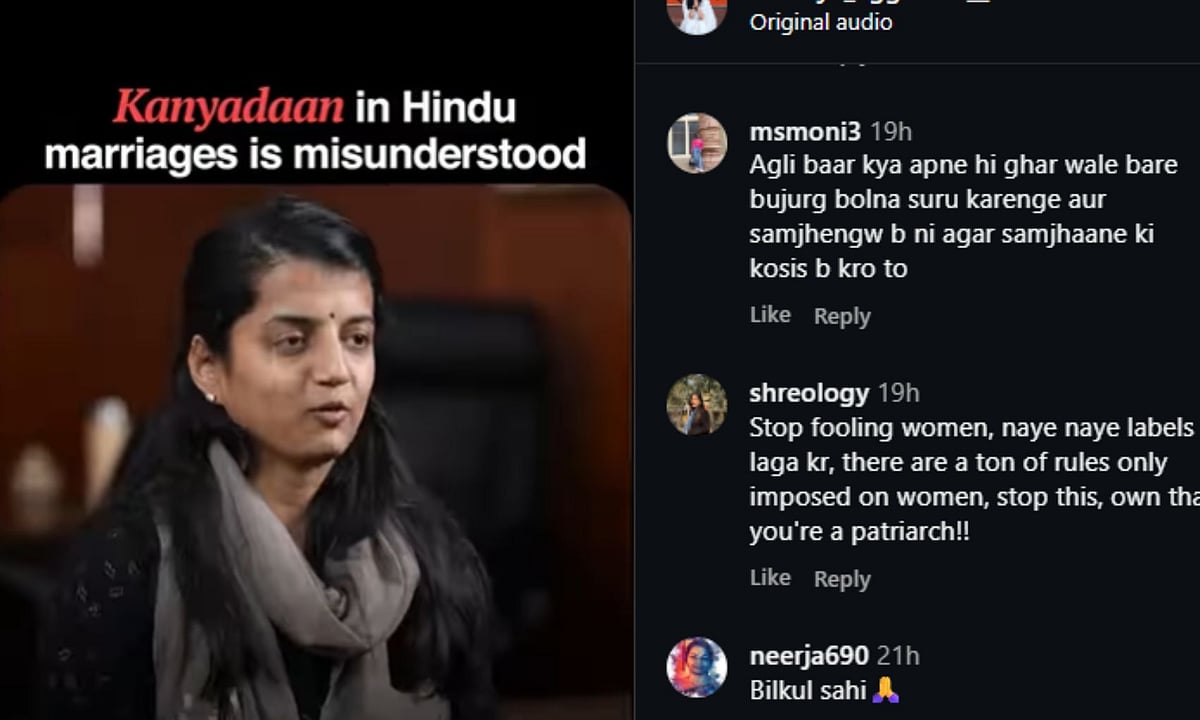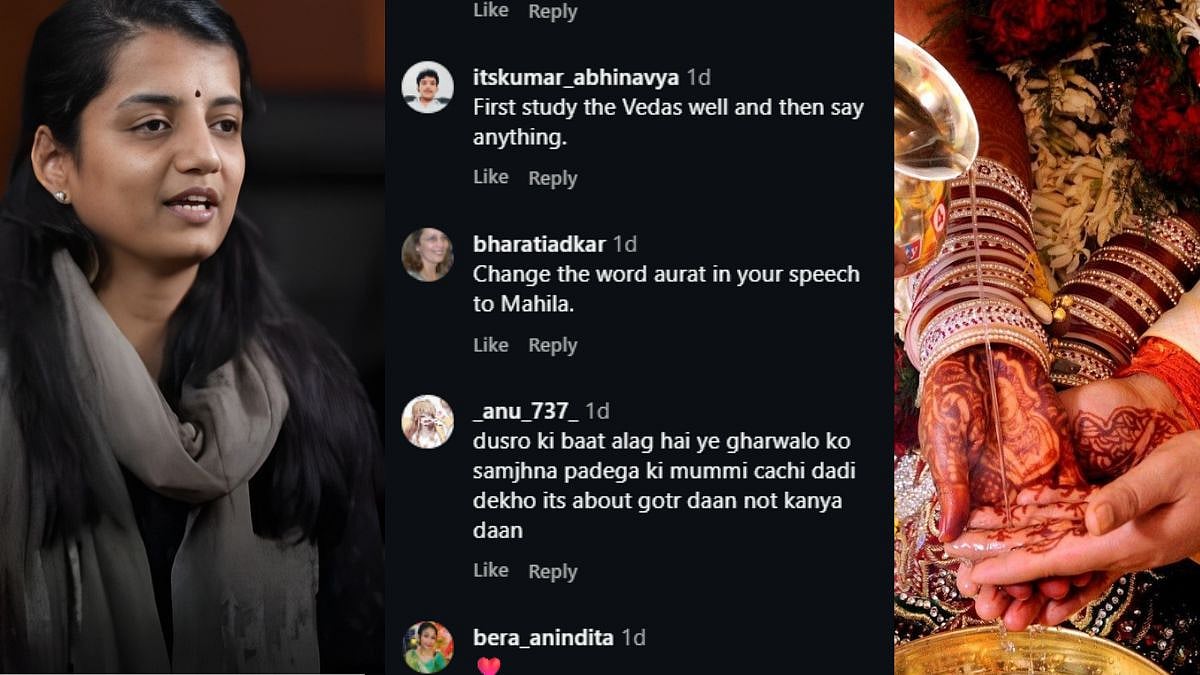 She further says, "The idea that a daughter is a commodity to be "donated" is a later social distortion, not a spiritual directive. In the original Vedic framework, the feminine was always a source of "Maan" (respect), never an object for "Daan." Stop defending a mistranslation and start reclaiming the actual precision of our scriptures."