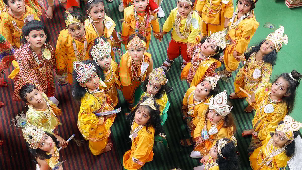 From kids dressing up as Radha-Krishna to Aarti at temples and dahi handi events, Lord Krishna's birthday is definitely a day to remember for all. Devotees fast, sing bhajans (devotional songs) and kirtans (hymns), and visit temples dedicated to Lord Krishna. In some places, reenactments of episodes from Krishna's life are performed as part of cultural programs known as "Ras Leela."