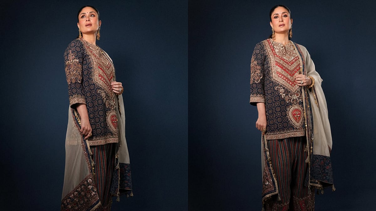 Instead of opting for predictable straight pants, Kareena went all out with a heavily detailed poncha salwar. Featuring vertical stripes and rich embroidery near the hem, the bottoms added volume and a vintage-inspired flair. Together, the kurta and pyjama set costs a decent ₹98,000, as per the label's website.