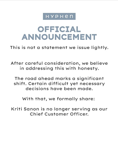 The statement read, "This is not a statement we make lightly. After careful study, we believe that this should be addressed honestly. The road ahead represents a tremendous transition. Certain painful but important decisions were taken. With that, we publicly announce that Kriti Sanon is no longer functioning as our Chief Customer Officer."