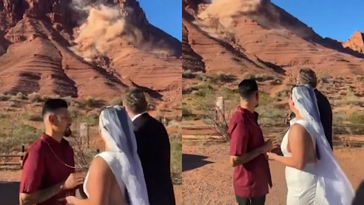 Within seconds, guests and the couple looked on in shock as a massive rockslide began cascading down the mountains behind them. The dramatic scene unfolded in real time, turning the already special moment into something straight out of a movie.
