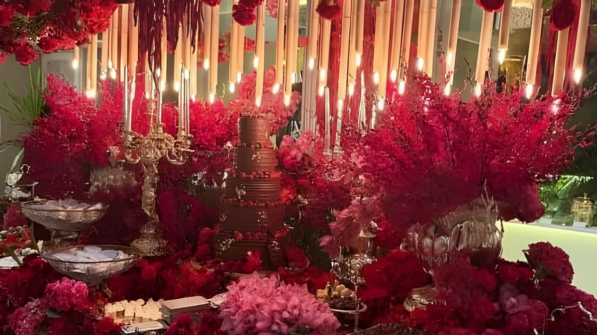 The ace couturier transformed his home into a scene straight out of a dream. Guests walking in were greeted by rich red blooms spilling across the space with roses, carnations, and anthuriums, creating an atmosphere of romance and festivity. Adding to the visual drama were upside-down candles suspended from the ceiling, illuminating the room with a soft, golden light.