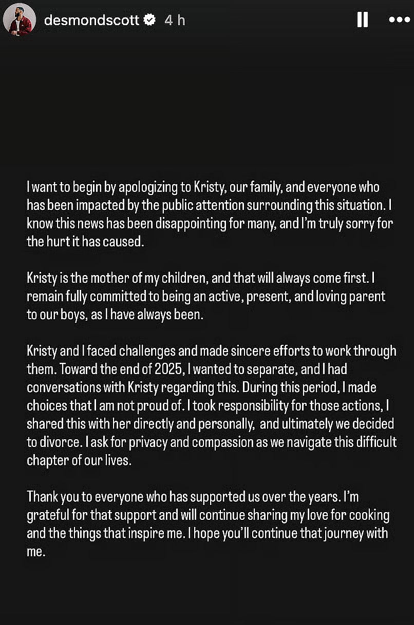 Kristy reportedly filed for divorce on December 30, 2025, after more than 11 years of marriage, stating "cheating" as the reason. The former couple share two sons, Vance and Westin. Following the divorce reports, Desmond briefly addressed the situation via an Instagram Story on January 11, offering a public apology.