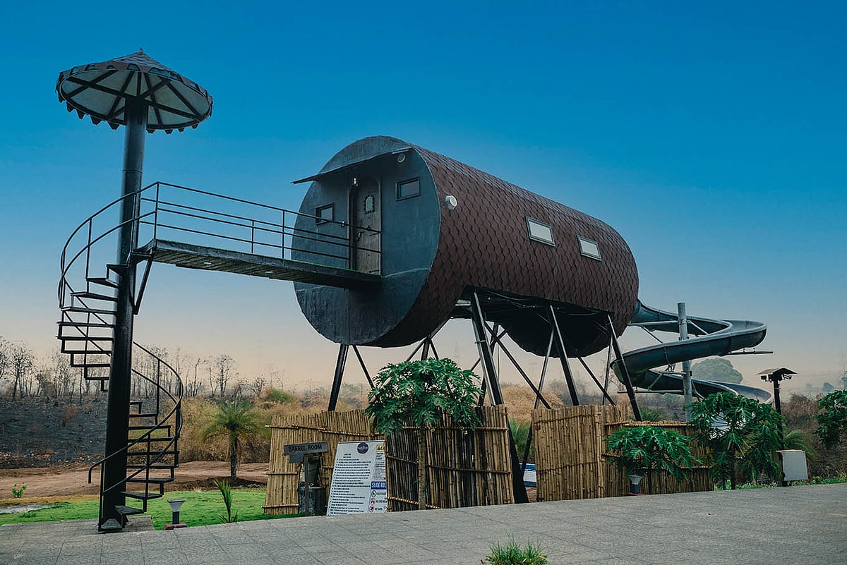 Tread cautiously by a glass flooring with views of a pool and verdant sit-out below. Just 2.5 hours away from Mumbai, this riverside retreat accommodates spacious, luxurious villas with antique and arty elements, four-poster swing beds, rustic furniture, and quirky cabanas. Barrel-living is a reality here at the tube-shaped Barrel Room with a vague balcony to slide straight down to the pool, or feel like an eskimo in the Igloo Room. A stunning river view beckons at the Stone Edge room. Soak in the plunge pool within slanting walls of the Pyramid Room. Relish appetising dishes in the lap of nature at Tinge restaurant, or Bougainvillea for a vegetarian treat.