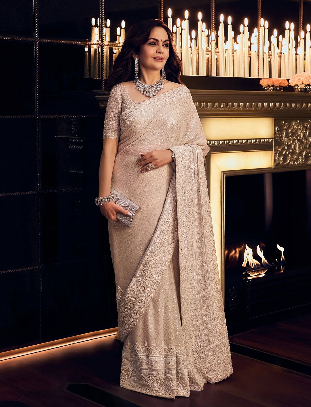 For her recent outing, Nita stepped out in a dreamy off-white saree by iconic designer duo Abu Jani Sandeep Khosla. The six yards, crafted in delicate georgette, featured an all-over shimmer with fine sequin detailing that subtly caught the light. It was further adorned with intricate Resham embroidery along the borders and elevated with French knot accents.
