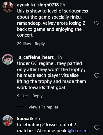 While having an off-time during the packed sporting schedule of over 2 months is equally important for players, netizens and fans haven't taken this well, considering Kolkata's recent performance in the first two matches. One commented, "No shame at all.. With zero performance." While one user wrote, "this is a show to level of seriousness about the game specially rinku, Ramandeep, vaivav arora losing 2 back to game and enjoying the concert."