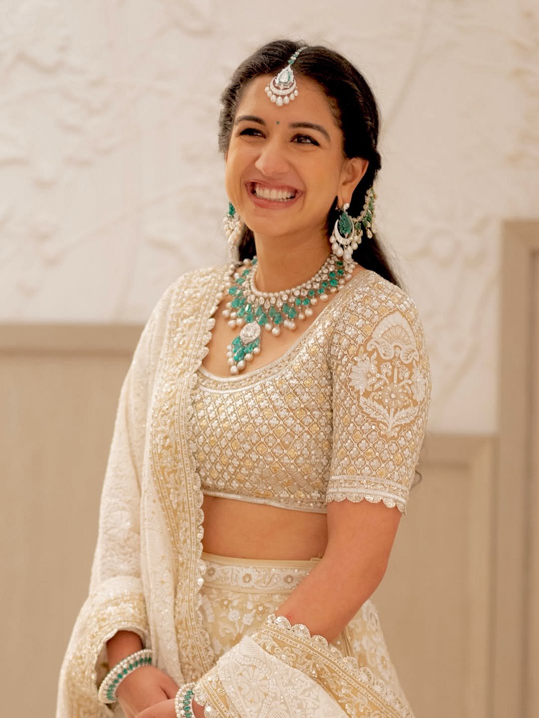 While the outfit remained serene in tone, Radhika introduced a dramatic contrast through her jewellery. She layered an opulent set featuring diamonds, pearls, and striking emeralds, instantly transforming the look into a royal statement.