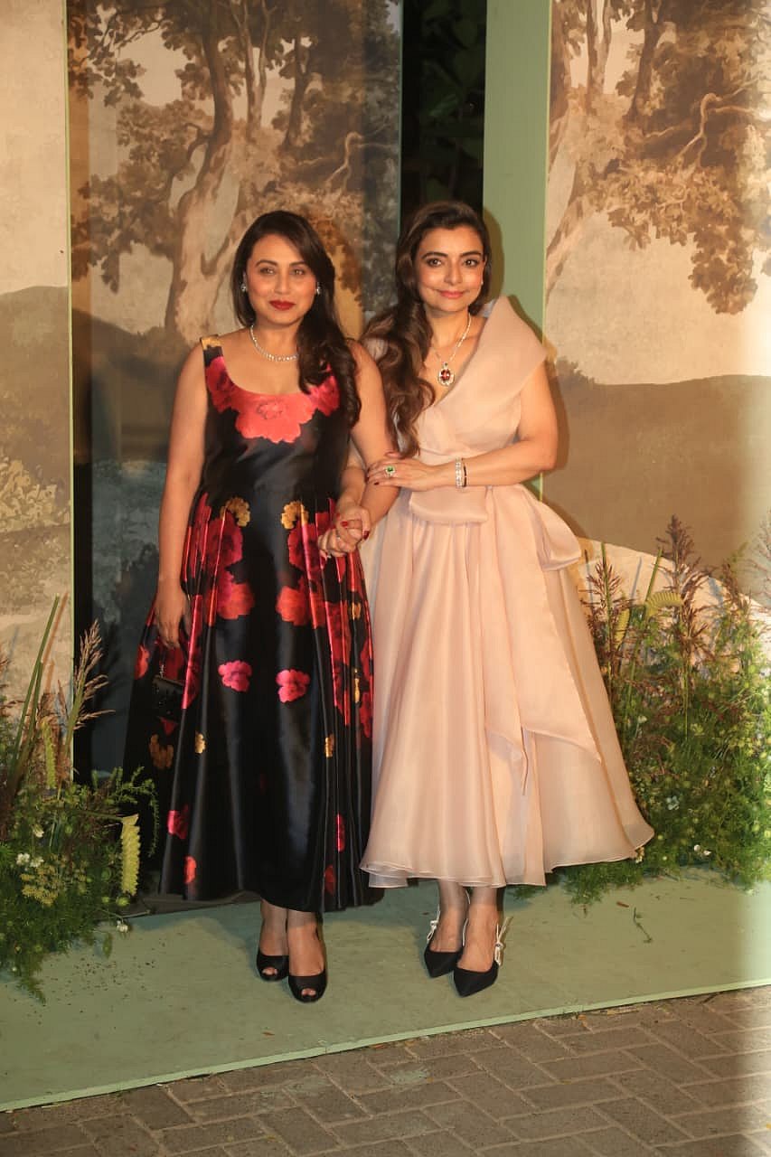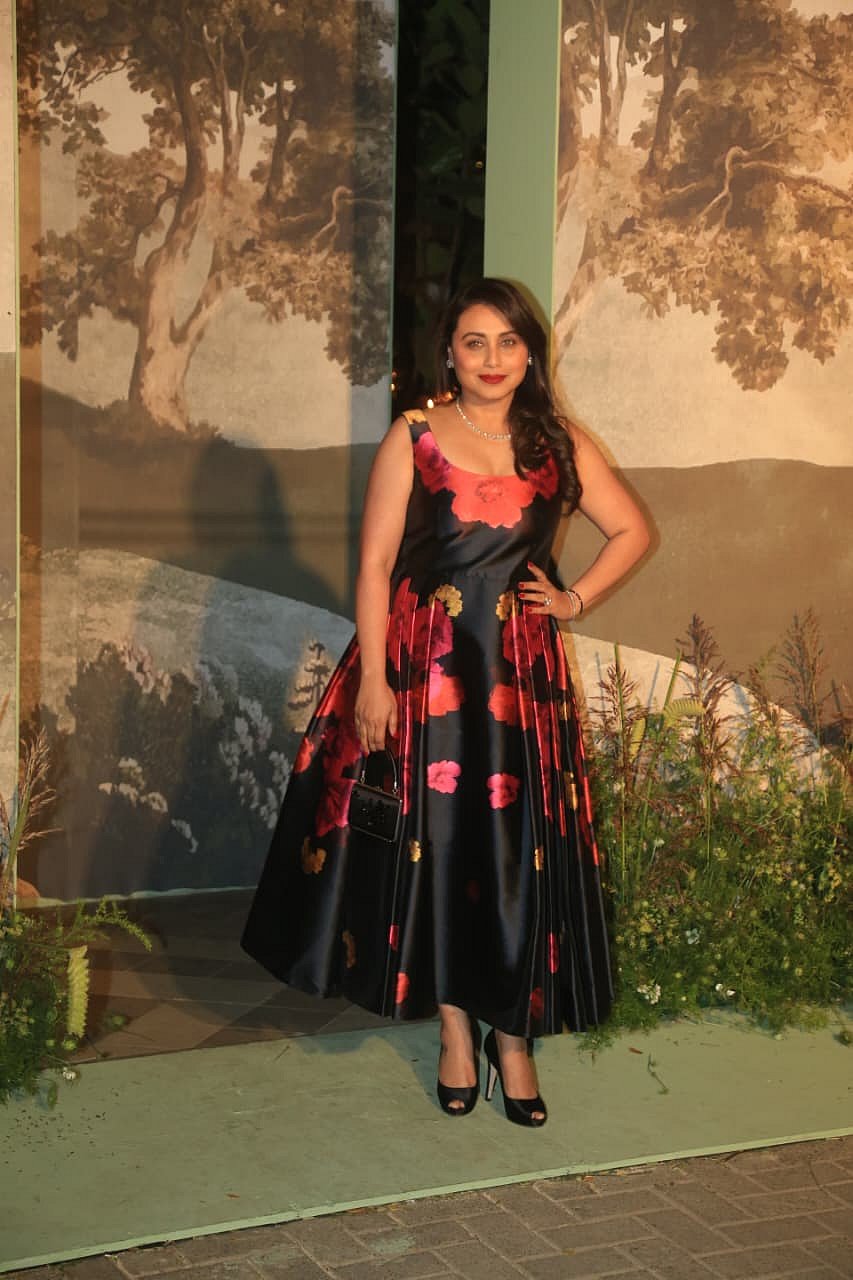 Rani Mukerji kept things elegant in a black floral midi dress that felt both timeless and festive. The dark base was covered with vibrant blooms, complete with a diamond choker, drop earrings, a sleek black bag and classic heels.