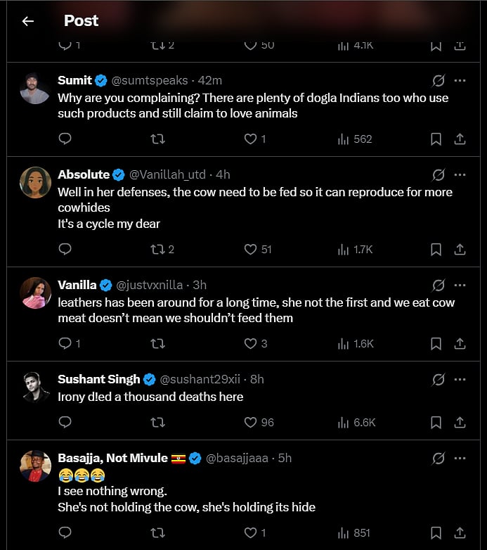 One user wrote, “Hope the cow does not recognise its hide.” Another commented, “Why are you complaining? There are plenty of ‘dogla’ Indians who use such products and still claim to love animals.”