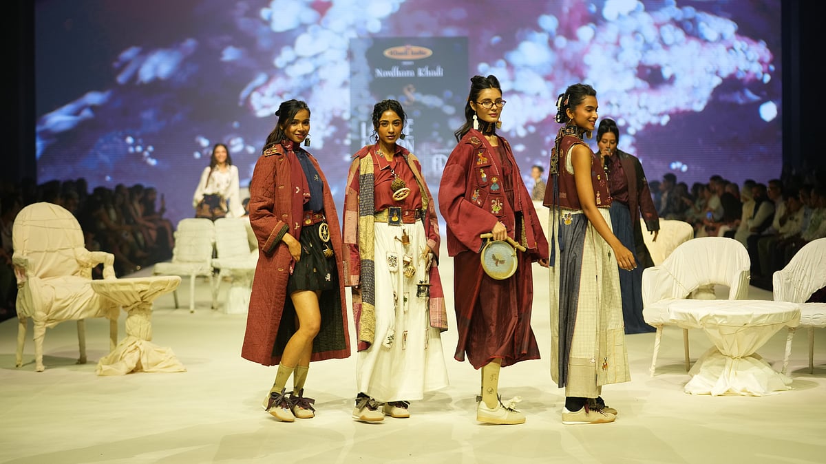 Sustainability, as a concept, was not restricted to a single day but was embedded in the collections through handwoven textiles, recycled materials, and thoughtful construction. The Navdhara Khadi showcase captured this shift most effectively. Designers like Samant Chauhan, CoEK (Centre of Excellence for Khadi), Pawan Sachdeva, and Shruti Sancheti demonstrated how Khadi can be reimagined in contemporary Indian fashion. Chauhan’s Bhagalpur silk gowns showcased the textural, structural, and experimental nuances of Khadi, while Sancheti gave Khadi varieties in silk, wool, linen, and cotton a fun, preppy twist. That same thinking echoed across the week, from Amit Aggarwal’s scintillating use of vintage Benarasi to create a sexy, structured evening-wear line to Aneeth Arora’s playful take on handwoven fabrics, showing how craft can be both rooted and forward-looking.