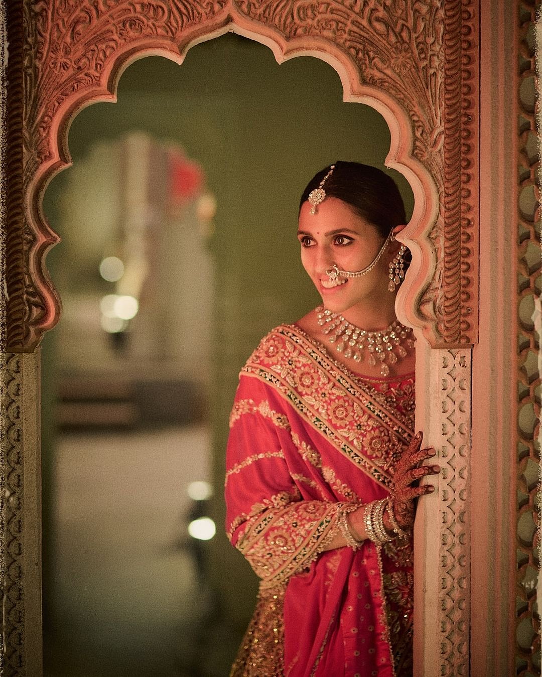 Shloka Mehta's wedding lehenga was styled by Diya Mehta Jatia for Anant-Radhika's wedding. While she shared Shloka's look on Instagram, she wrote, "We wanted to create a special look that celebrates love and what better than @shloka11’s own wedding lehenga. We decided to change the undertone to pink for a fresh look."also