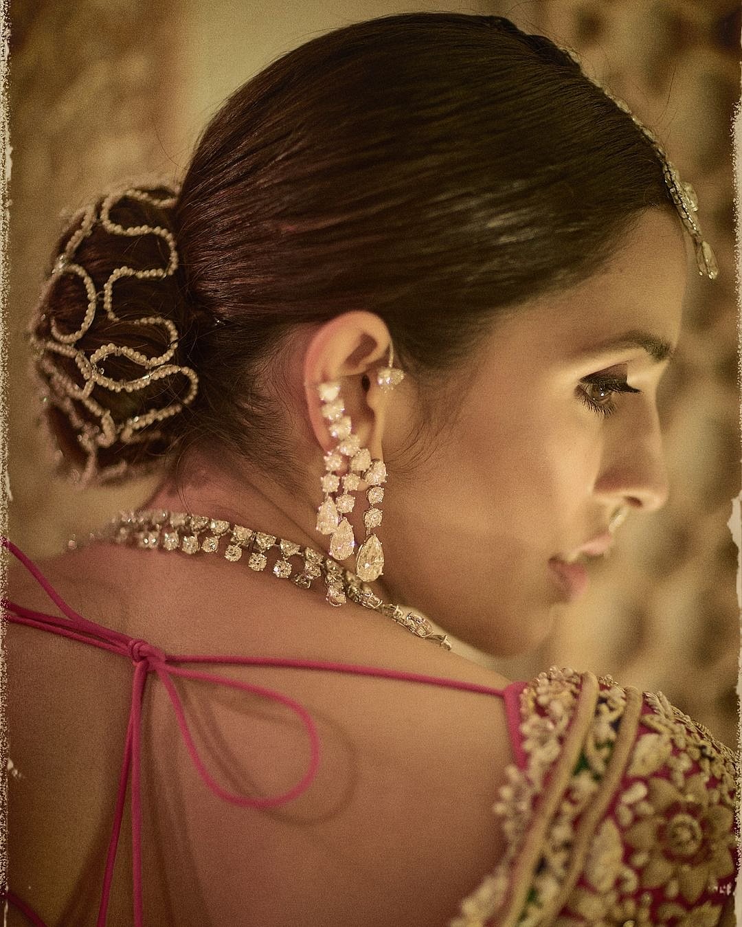 Instead of long and heavy jhumkas, she wore solitaire ear-cuffs and a maang tika that complemented her necklace. For her hair, she wore a diamond and pearl juda bun that looked absolutely gorgeous on her.
