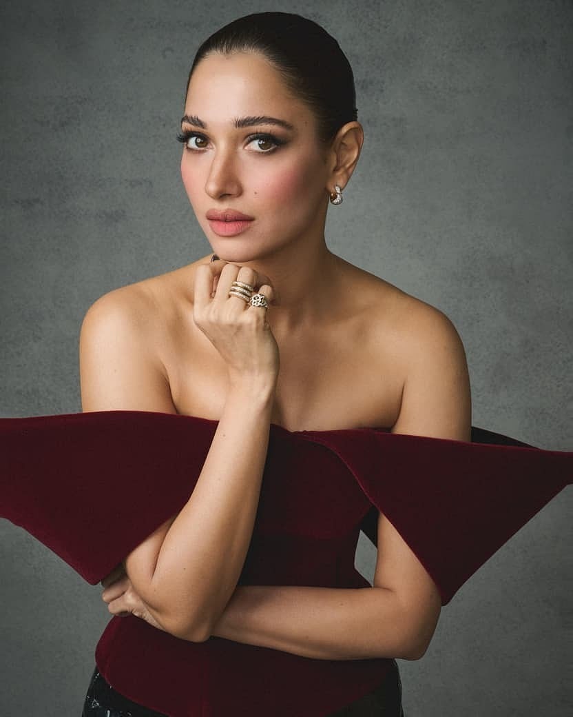 Accessories were kept minimal yet luxe, with delicate earrings and statement rings from her own label, Tamannaah Fine Jewellery. Her glam was equally breathtaking, featuring glowing skin, soft rosy tones, luminous eyes, and nude lips. A sleek bun completed the look, keeping the focus on her outfit.