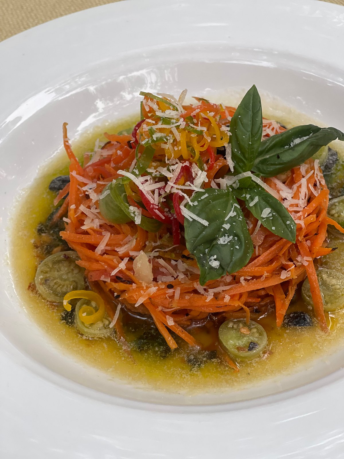 Method: Make fine zoodles of fresh carrots lengthwise and blanch them in a vegetable stock, al dente. Stone the olives, halve the cherry tomatoes and pluck the sage leaves and set aside. Make Beurre Noisette by adding Margarine to a hot pan and cooking it till a nutty flavour is achieved. Quickly add the sage leaves so as to have the flavour imbibe in the butter. Add the olives, tomatoes and the carrot zoodles and toss in the butter to coat the ingredients. Finish off with finely grated vegan cheese and serve piping hot in a pasta bowl.