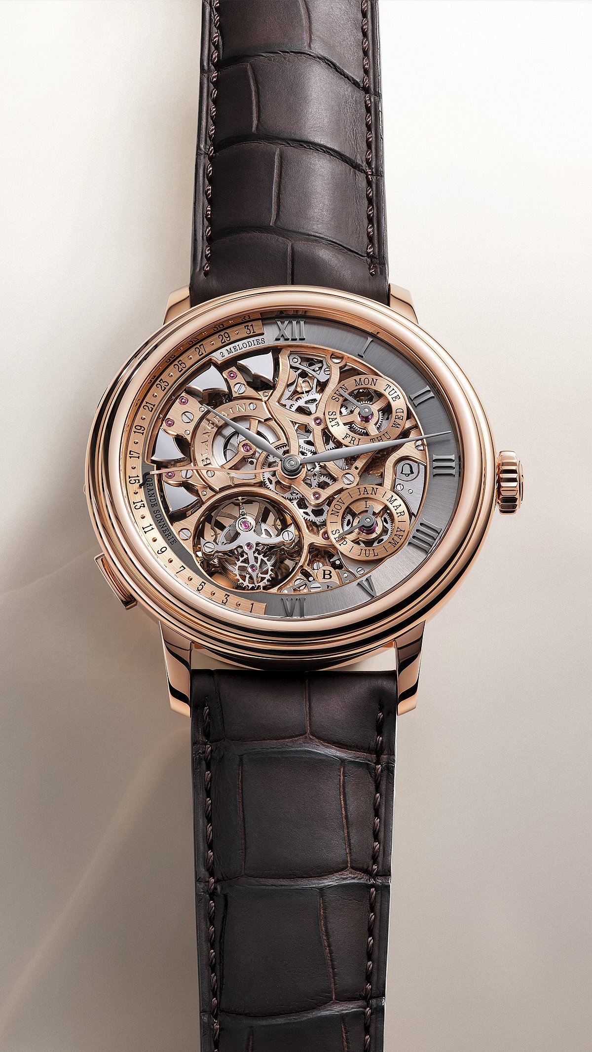 The most complicated watch in Blancpain’s history, the Grande Double Sonnerie represents the summit of acoustic watchmaking. In a rare feat, the fully integrated movement combines a grande sonnerie, petite sonnerie, minute repeater, a retrograde perpetual calendar, and a 4 Hz flying tourbillon. The watch has two selectable melodies via a case pusher: Westminster chime and a Blancpain composition by musician Eric Singer from the American rock band Kiss. An acoustic membrane integrated into the bezel enhances sound transmission. The project took over eight years, 1,200 technical drawings, 21 patents filed during development and 13 incorporated into the construction, 1,053 components for the movement, all entirely designed, produced, decorated, and assembled in-house. The complexity here is staggering, but what sets this watch apart is control of energy, sound resonance, and mechanical coordination. In 2025, no watch better demonstrates why chiming complications remain the ultimate expression of horological mastery.