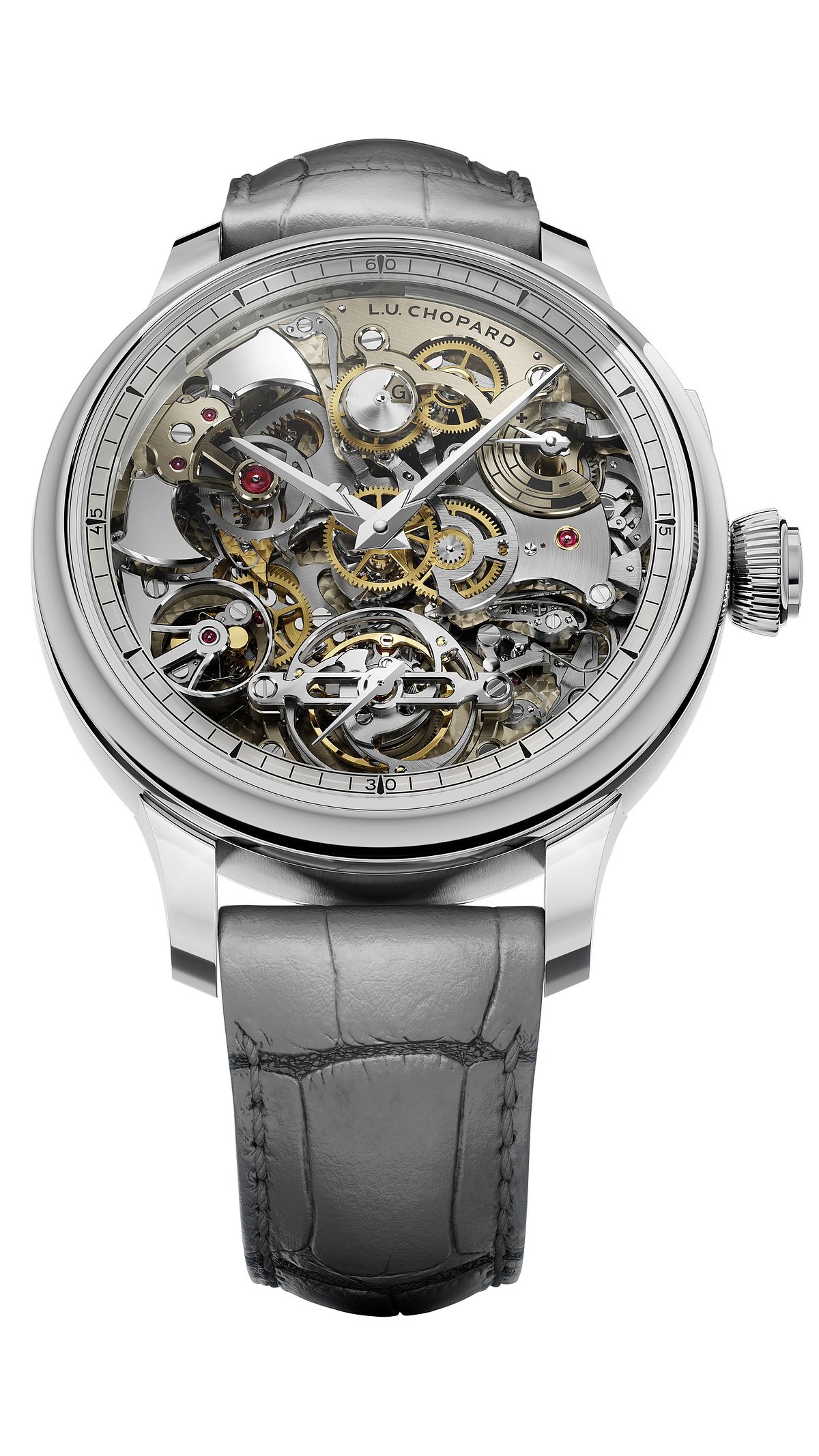 The Chopard L.U.C Grand Strike is a statement of horological maturity. In addition to its grande sonnerie, petite sonnerie, and minute repeater, the watch incorporates a tourbillon, elevating its technical stature. The combination of a regulating organ designed for precision and a complex chiming system requires extraordinary mastery of energy management. Chopard enhances the acoustic performance through sapphire gongs and meticulous hand-finishing. It’s rare to see a complex watch like this achieve a Contrôle officiel suisse des Chronomètres (COSC) certification for precision and a Geneva Seal for aesthetics.