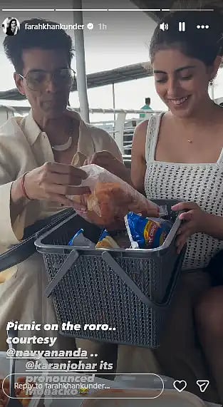 Bollywood’s favourite filmmaker duo, Farah Khan and Karan Johar, recently turned a casual ferry ride into a full-blown celebrity picnic! The two were spotted aboard the Mumbai-Alibaug Ro-Ro ferry, joined by none other than Navya Naveli Nanda, who came well-prepared-with a delicious basket of snacks that instantly became the highlight of the trip.