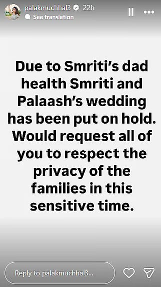Soon after, Palash himself was admitted to the hospital due to a viral infection and acidity-related complications. On Monday, his sister and singer Palak Muchhal shared on Instagram, “Due to Smriti’s dad’s health, Smriti and Palaash’s wedding has been put on hold. Would request all of you to respect the privacy of the families in this sensitive time.”