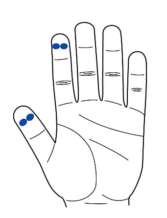 Press the highlighted area on the thumb (see figure) for five to 10 minutes. After that, apply blue colour (two dots). On it apply moong seeds and keep for three to four hours. Use medical adhesive tape to hold the seeds in place. This is complementary to the above remedies. Consult ophthalmologist if problem persists.